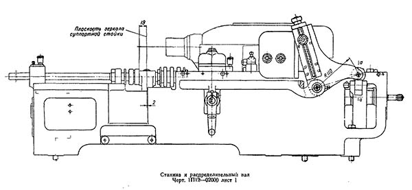 Станина та розподільний вал верстата поздовжнього точення . Дивитись у збільшеному масштабі