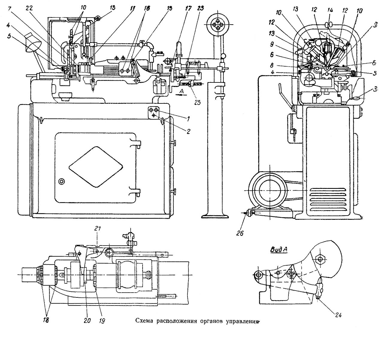 Вертикальні супорти 2, 3 та 5 розташовані на спеціальній стійці, мають прямолінійне переміщення та управляються від самостійних кулачків розподільчого валу. Два горизонтальні супорти 1 і 9 розташовані на балансирі 10, мають коливальний рух навколо осі 11 і управляються обидва від одного кулачка 12.