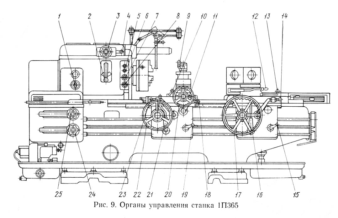 Розташування органів керування токарно-револьверним верстатом 1П365. Дивитись у збільшеному масштабі