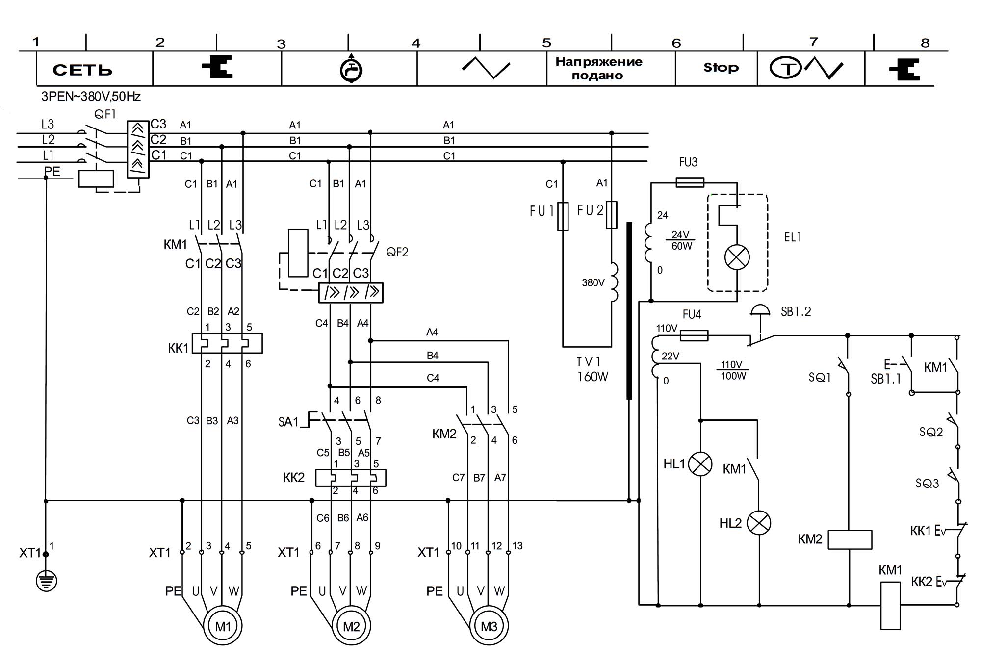 При отпускании толчковой кнопки SQ1 ланцюг керування разомкнется і катушка пускателя обесточится, т.е. контакты КМ2 разомкнутся і електродвигатель М3 выключится. Пуск і зупинка електронасоса М2 осуществляются з помощью переключателя SA1, установленного на лицевой панелі електрошафи.
