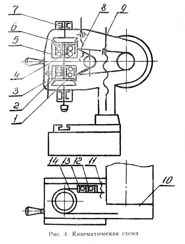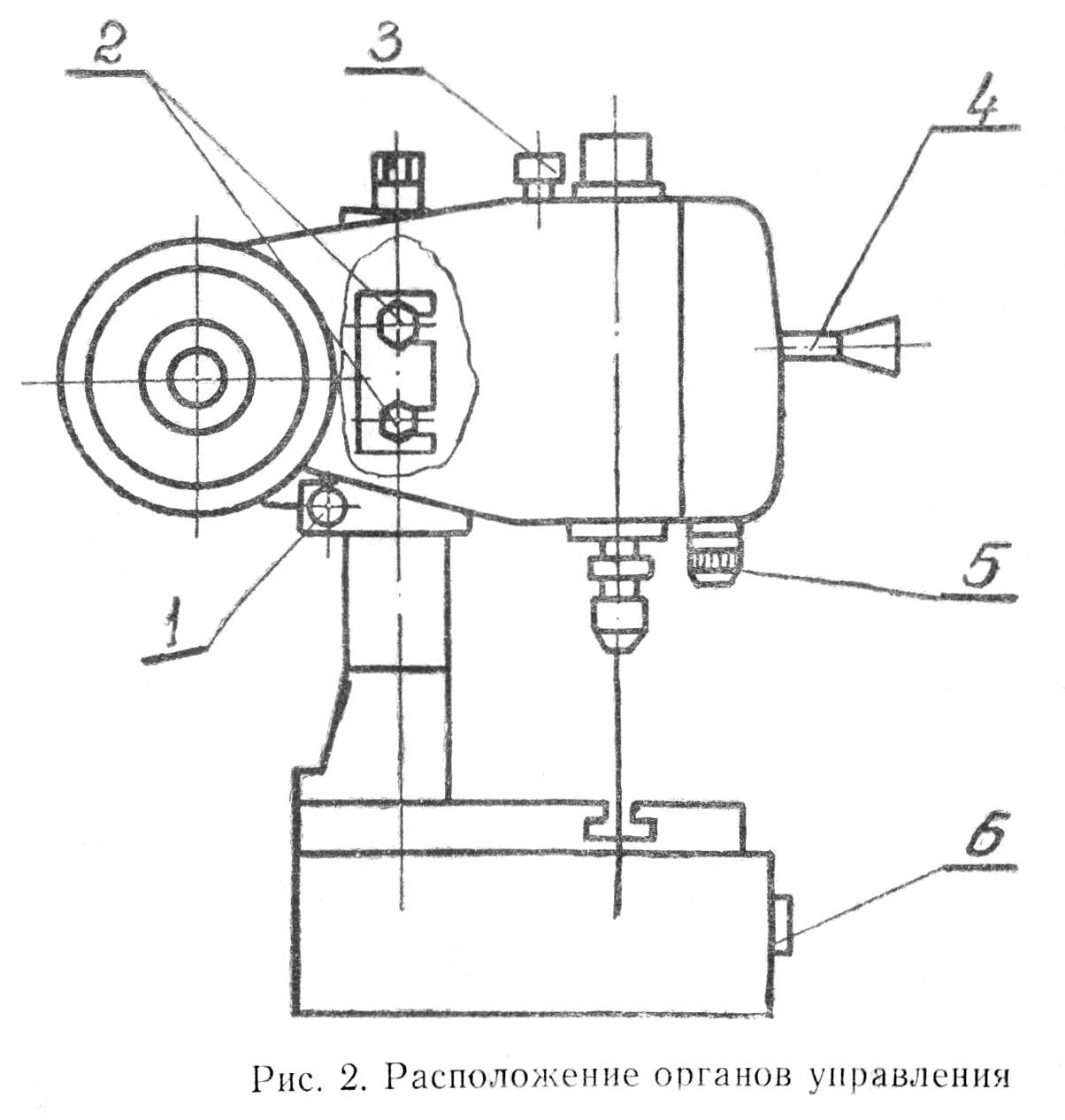 Електродвигун, встановлений збоку на корпусі головки верстата, передає обертання через шківи приводні шпинделю. Включення прямого та зворотного обертання шпинделя здійснюється фрикційними та конусними муфтами.