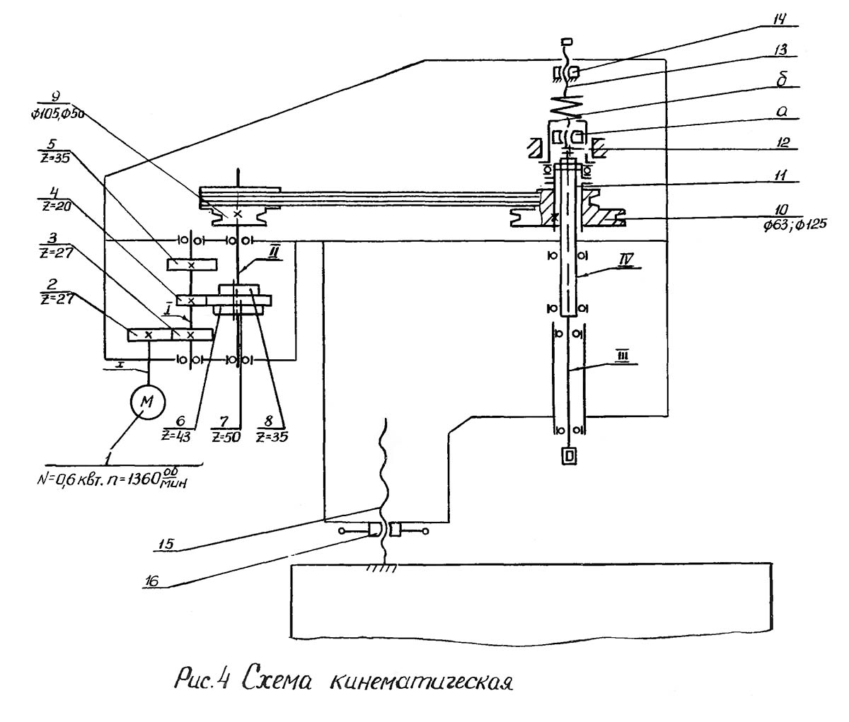 С вала II вращение передається через клиноременную передачу з двухступенчатыми шкивами 9 і 10 і предохранительную муфту вала III, а з него через две шпонки шпинделю IV. Таким образом, шпинделю може быть сообщено 6 частот обертання.