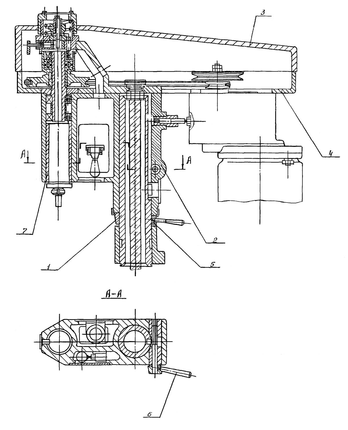 Головка (рис. 7, стр. 46) устанавливается на тумбе і состоит из колонны 1, корпуса 2, верхнего корпуса 4 і крышки 3. Корпус 2 може перемещаться вертикально по колонне 1 при помощи гайки 5 і закрепляется в любом положении рукояткой 6. В передньої частини корпуса 2 размещен шпиндель, который може перемещаться во втулке 7. Верхний корпус 4 крепится сверху на корпусе 2, а к нему, в свою очередь, крепится коробка швидкостей. В верхнем корпусе 4 размещена клиноременная передача, предохранительное пристрій і копирная пара. Сверху на верхний корпус 4 одевается крышка 3.