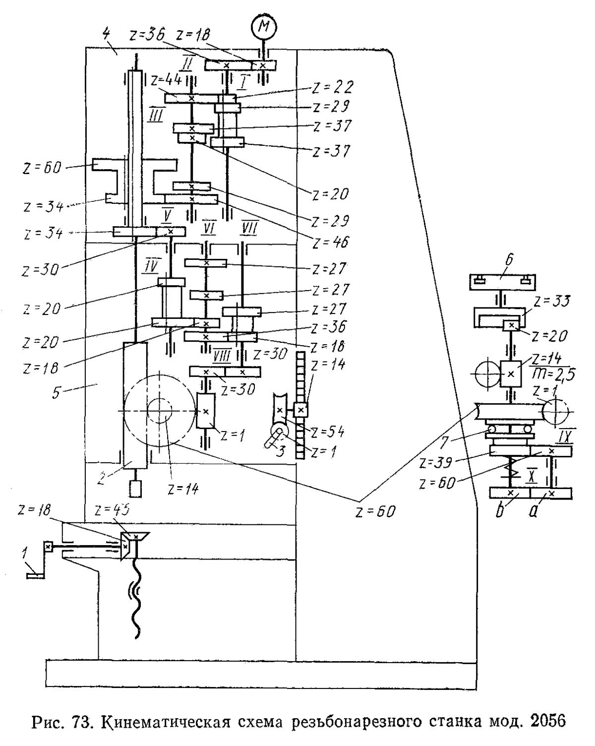 Осевое перемещение шпинделя, согласованное з его вращением, обеспечивается в станке коробкой подач 5 і механізмом подач. Шпиндель верстата смонтирован на шарикопідшипниках в гильзе 2, на наружной поверхности которой нарезана рейка, находящаяся в зацеплении з реечным зубчатым колесом z = 14. Рух к реечной паре передається от зубчатого колеса z = 34, установленного на шлицевой втулке шпинделя в коробке швидкостей, і далее по следующей кінематичної ланцюги: зубчатое колесо z = 30, трехваловая коробка подач з двумя блоками зубчатых колес z = 20—20 і z = 18—27, зубчатая пара (30/30), червячная пара (1/60), предохранительная шариковая муфта 7, зубчатая передача (39/60), сменные зубчасті колеса (a/b) гітари подач, реечное зубчатое колесо z = 14, гильза со шпинделем. Четырехскоростная коробка подач і набор сменных зубчатых колес гітари подач позволяют настроить верстат на нарезание восьми различных шагов різьб в диапазоне 1..3,5 мм.