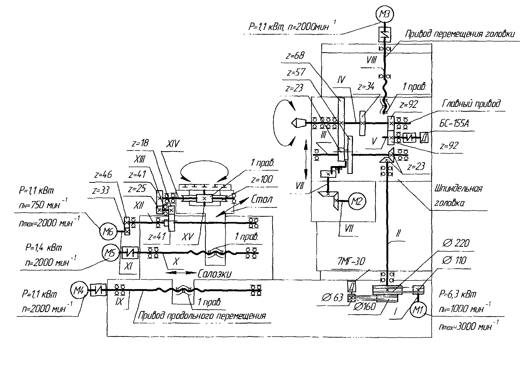 Схема кінематична горизонтального сверлильно-фрезерно-расточного верстата 2206ВМФ4. Дивитись у збільшеному масштабі