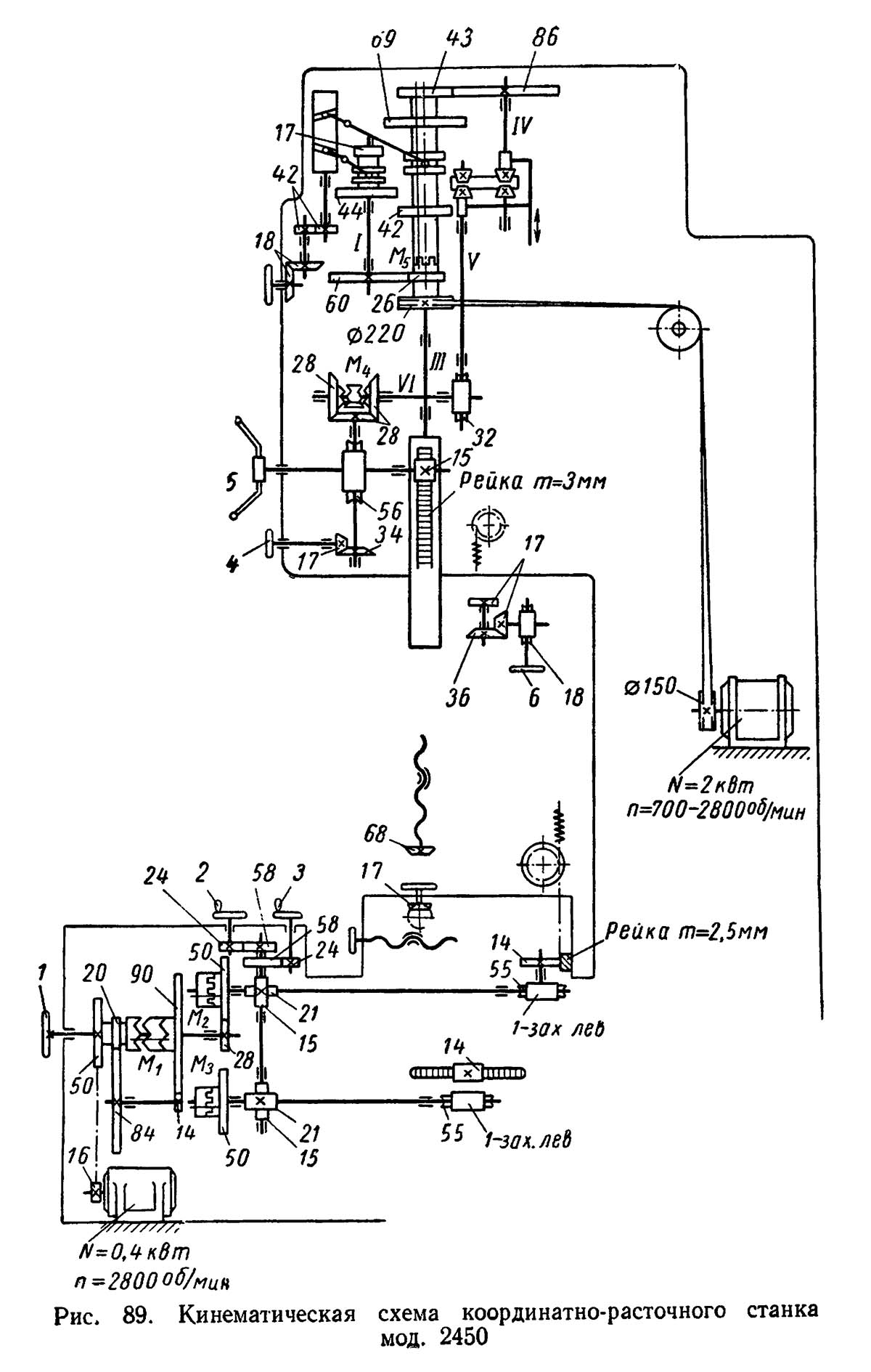 1. Кінематична схема координатно-расточного верстата 2450. Дивитись у збільшеному масштабі