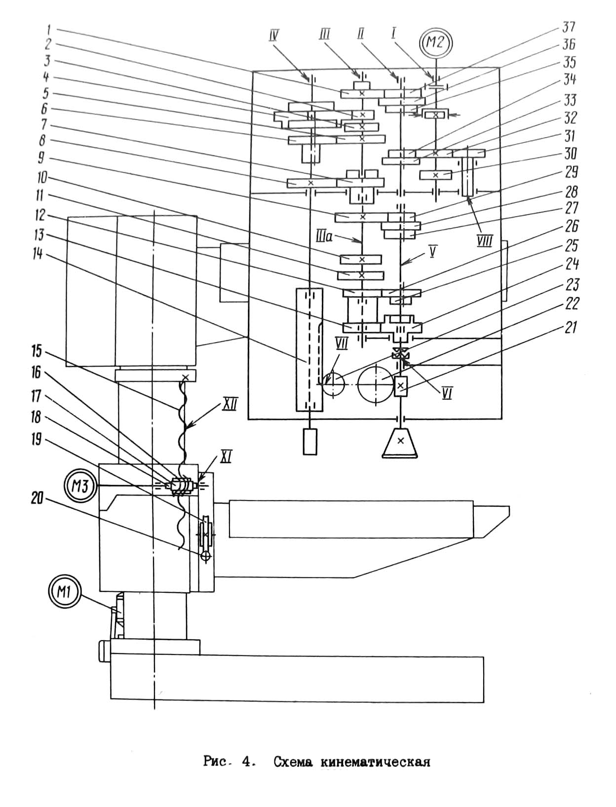 Коробка швидкостей расположена в левой частини корпуса сверлильной головки. Валы коробки смонтированы вертикально на шарикопідшипниках в расточках корпуса і плиты.