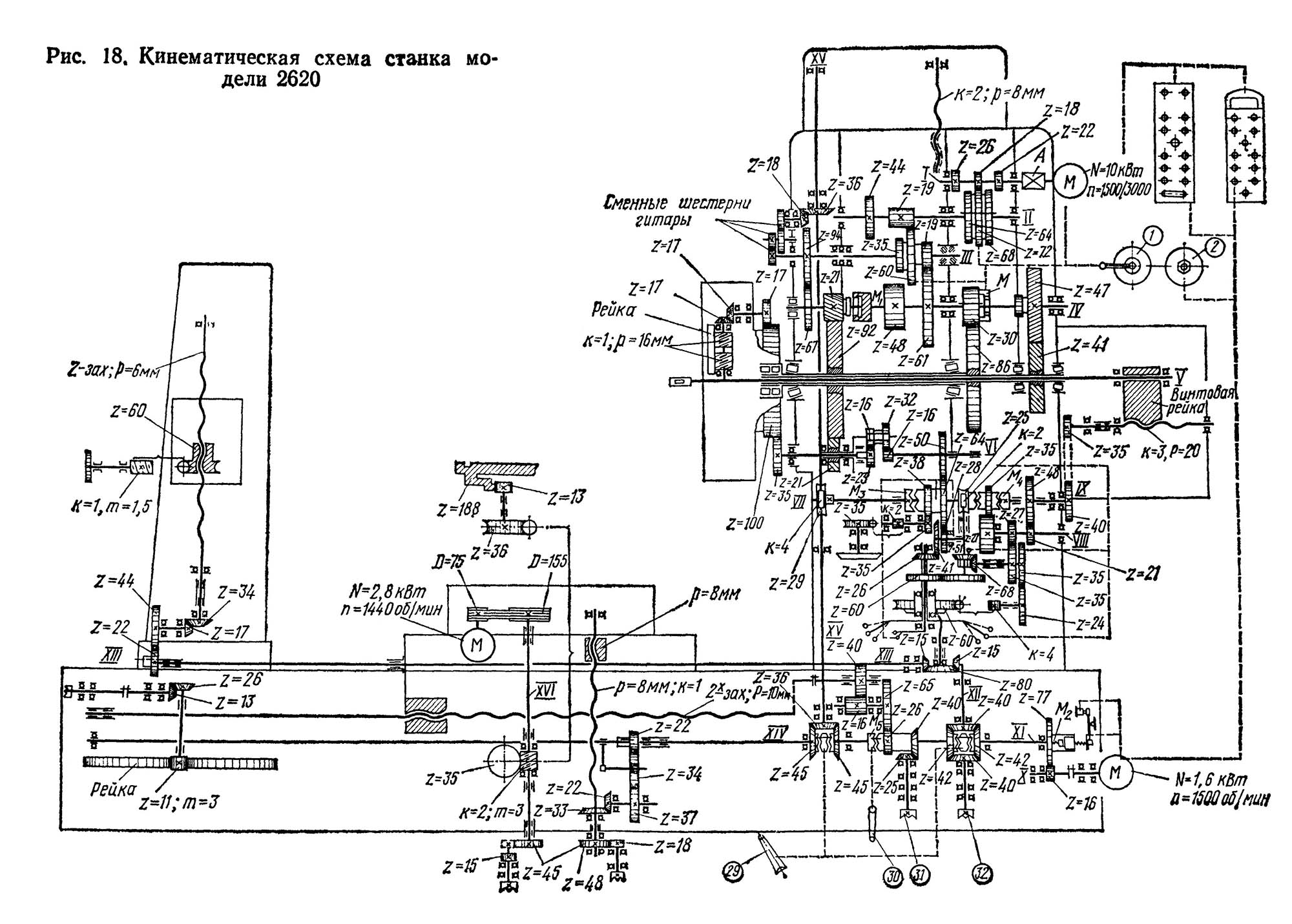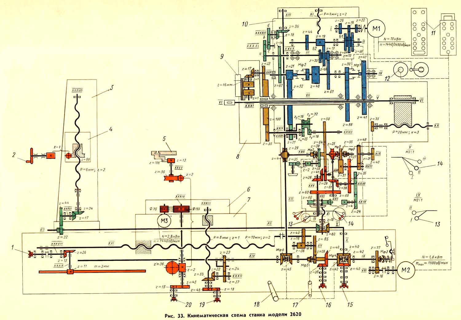 2. Кінематична схема горизонтально-расточного верстата 2620. Дивитись у збільшеному масштабі