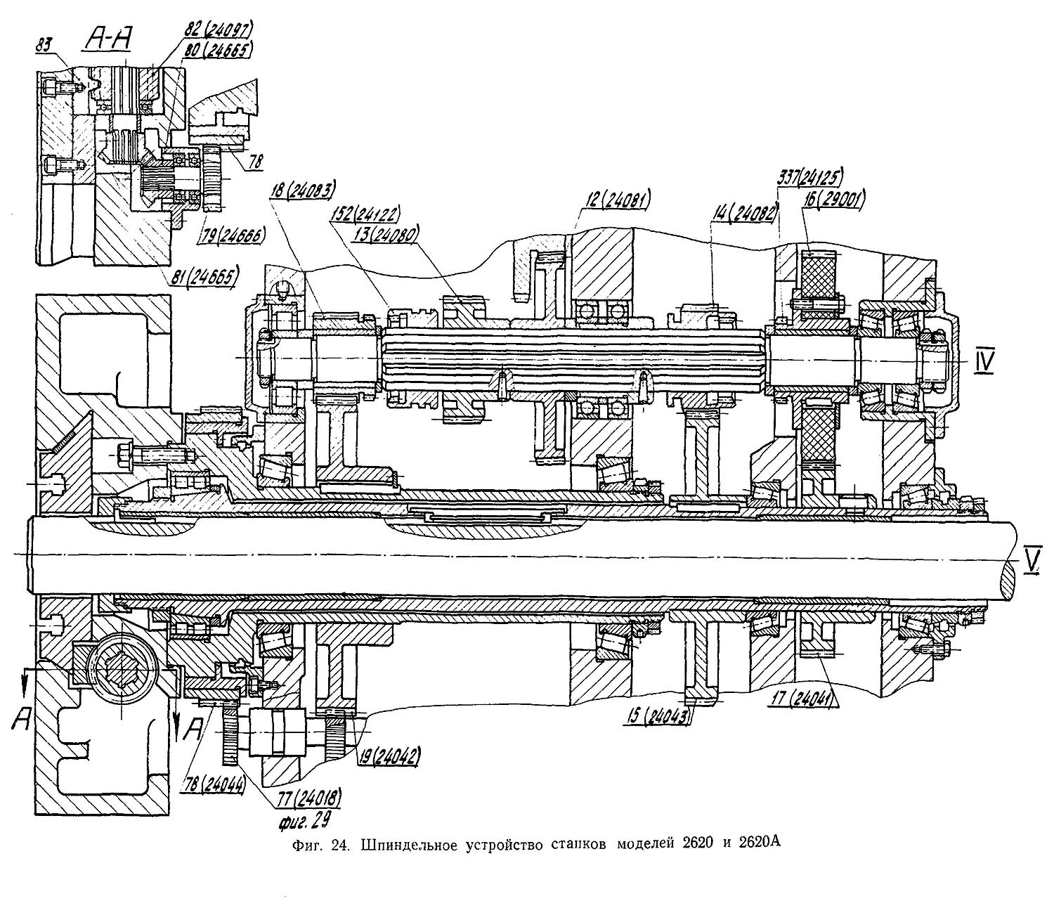 Шпиндельное пристрій верстатів моделей 2620 і 2620А (фиг. 24) состоит из выдвижного расточного шпинделя диаметром 90 мм, полого шпинделя і шпинделя планшайби. Азотированный расточной шпиндель перемещается внутри термообработанных з високою твердостью длинных направляючих втулок, запрессованных в полый шпиндель.