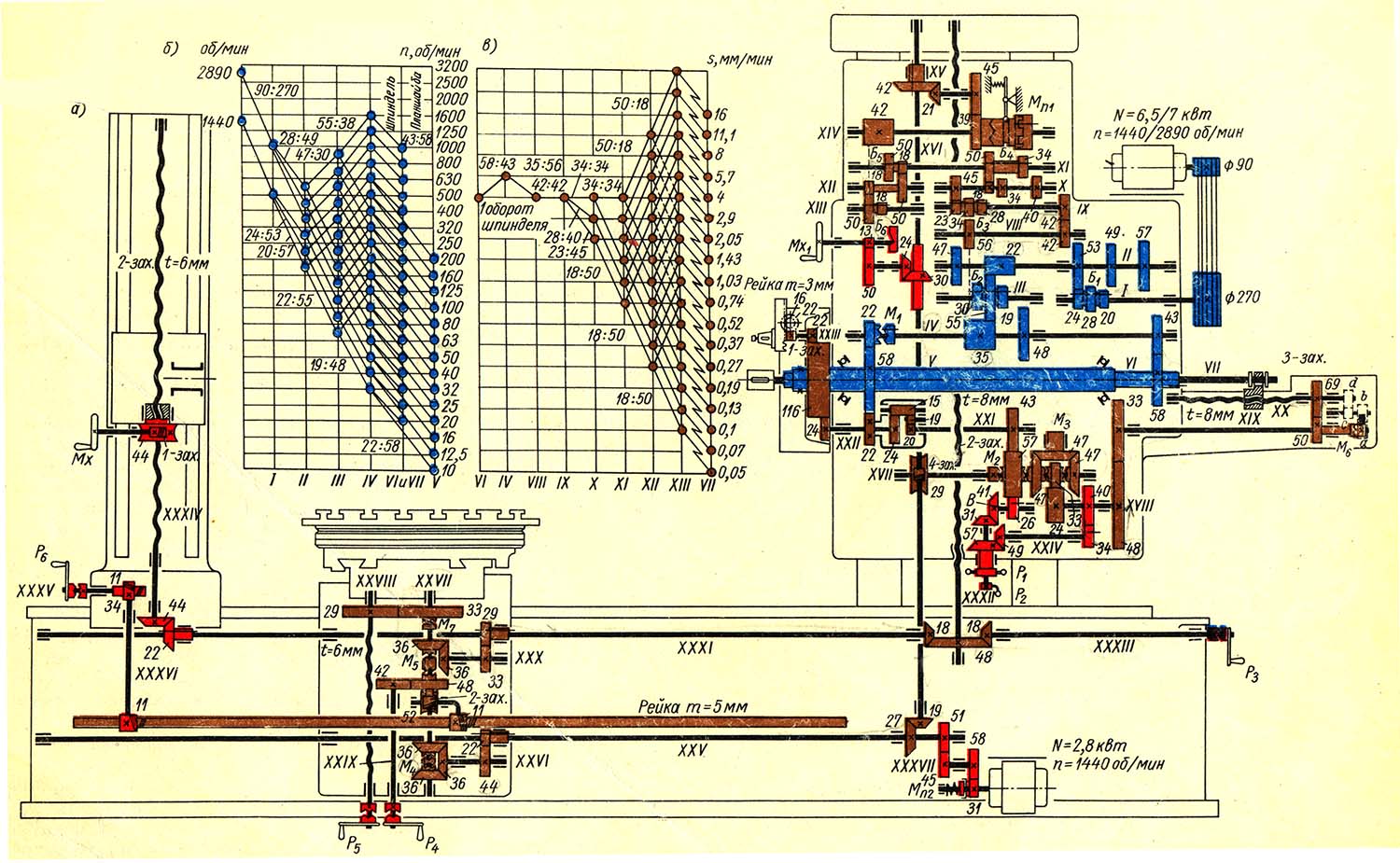 Эти руху заимствуются от вала IV. Вращение передається через шестерни 35—56, вал VIII, колеса 42—42, вал IX, блок шестерен Б3. вал X, блок шестерен Б4, вал XI, блок шестерен Б3, полый вал XII, блок шестерен Б6 і вал XIV. От вала XIV через предохранительную муфту Мп , цилиндрические шестерни 39—45 і конические колеса 21—42 приводится во вращение вертикальний вал XVI. Структура коробки подач видна из графика (рис. 64, в).