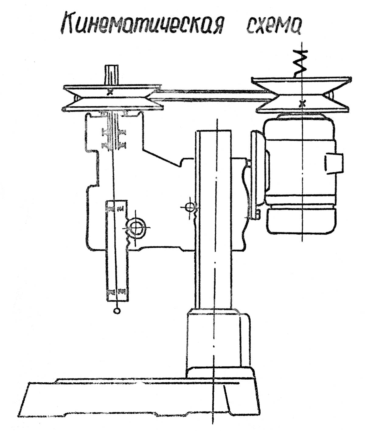 Привід головного руху осуществляется от електродвигуна ДПД22—4 или А09 через клиноременную передачу (текстропный ремень клинообразного профиля). Рух передається от ведущего шкива к ведомому і далее на шпиндель і инструмент.