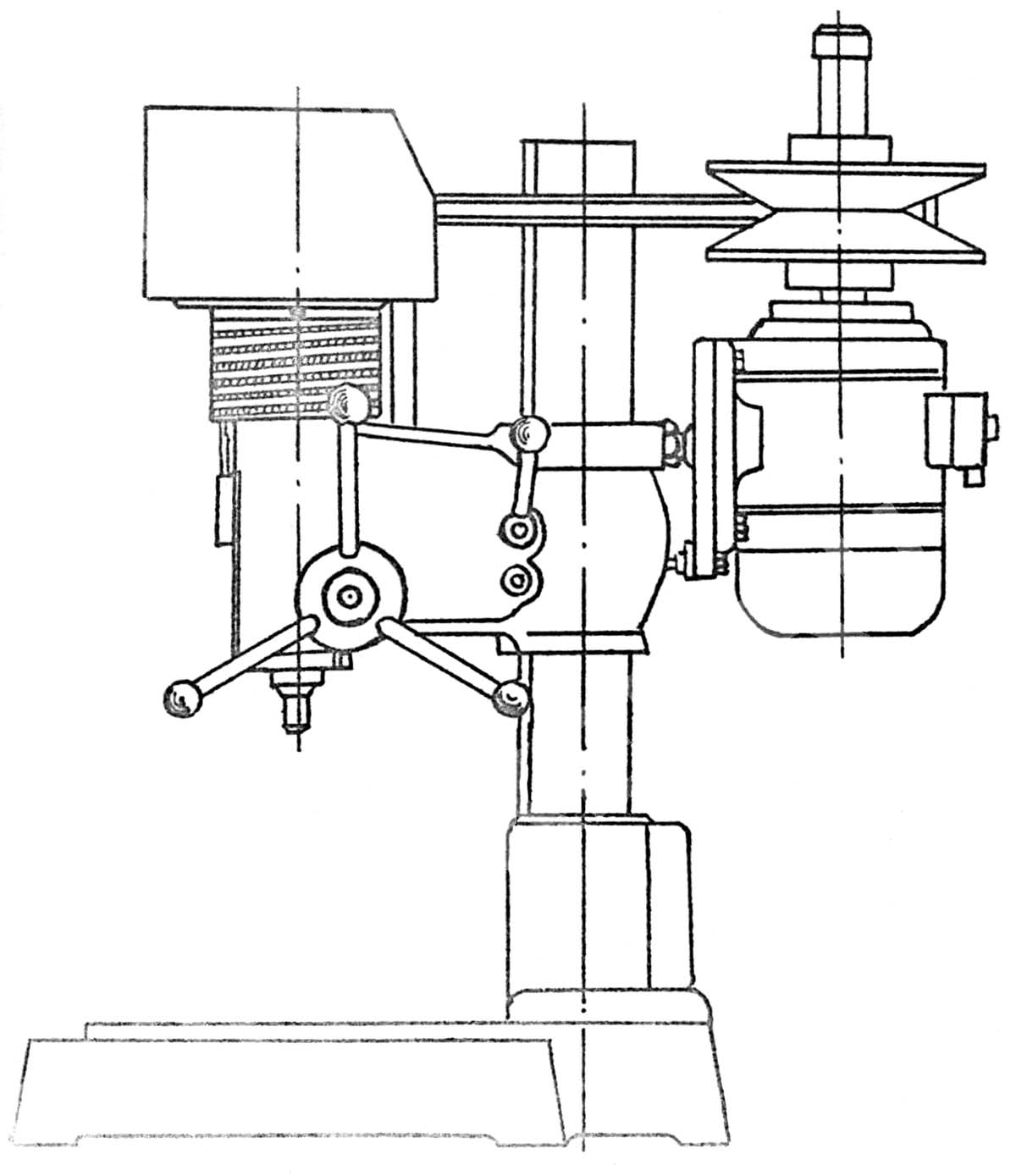 Верстат работает з ручной подачей. Подача осуществляется от рукоятки через реечную шестерню 3, пиноль 2 і радиально-упорный подшипник к ней. Высота шпиндельной бабки устанавливается рукояткой з реечной шестерней 4 і зажимается рукояткой зажиму на колонне.