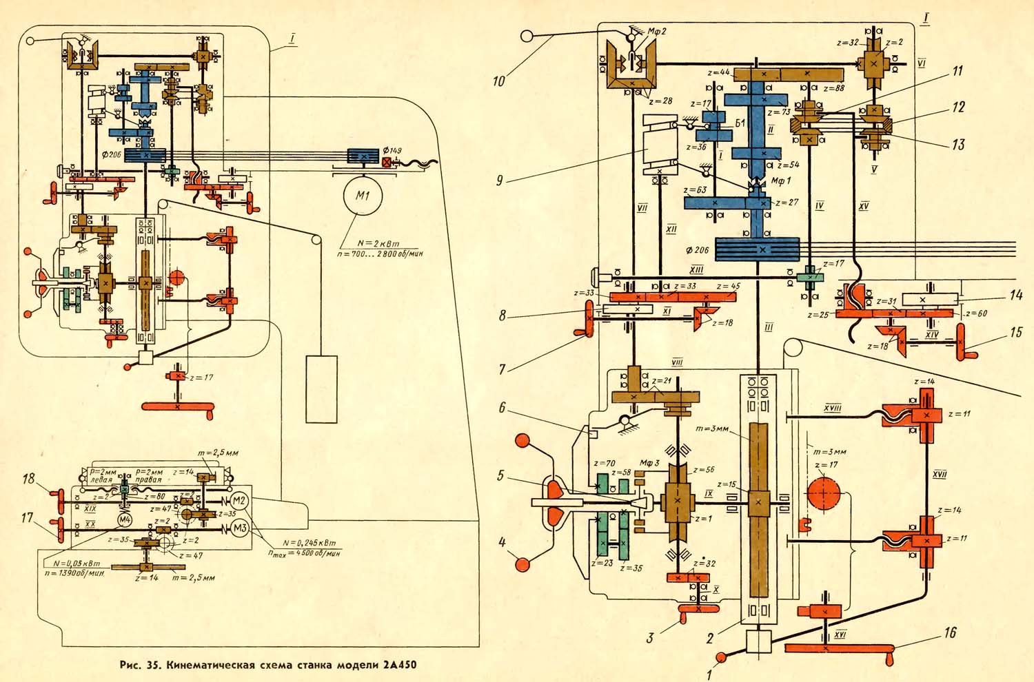 Кінематична схема координатно-расточного верстата 2А450. Дивитись у збільшеному масштабі