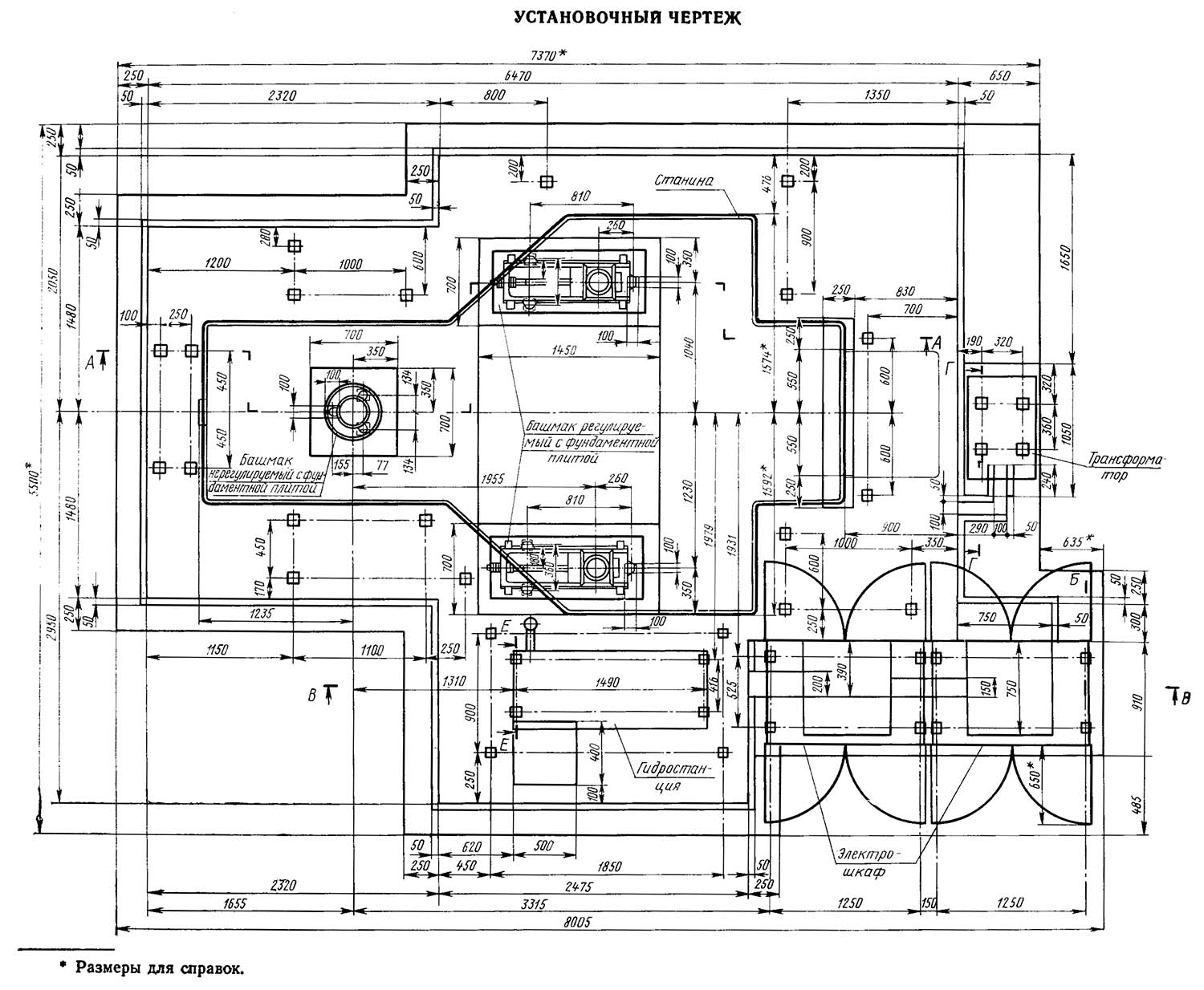 Настановне креслення координатно-розточувального верстата 2Е470. Завантажити у збільшеному масштабі