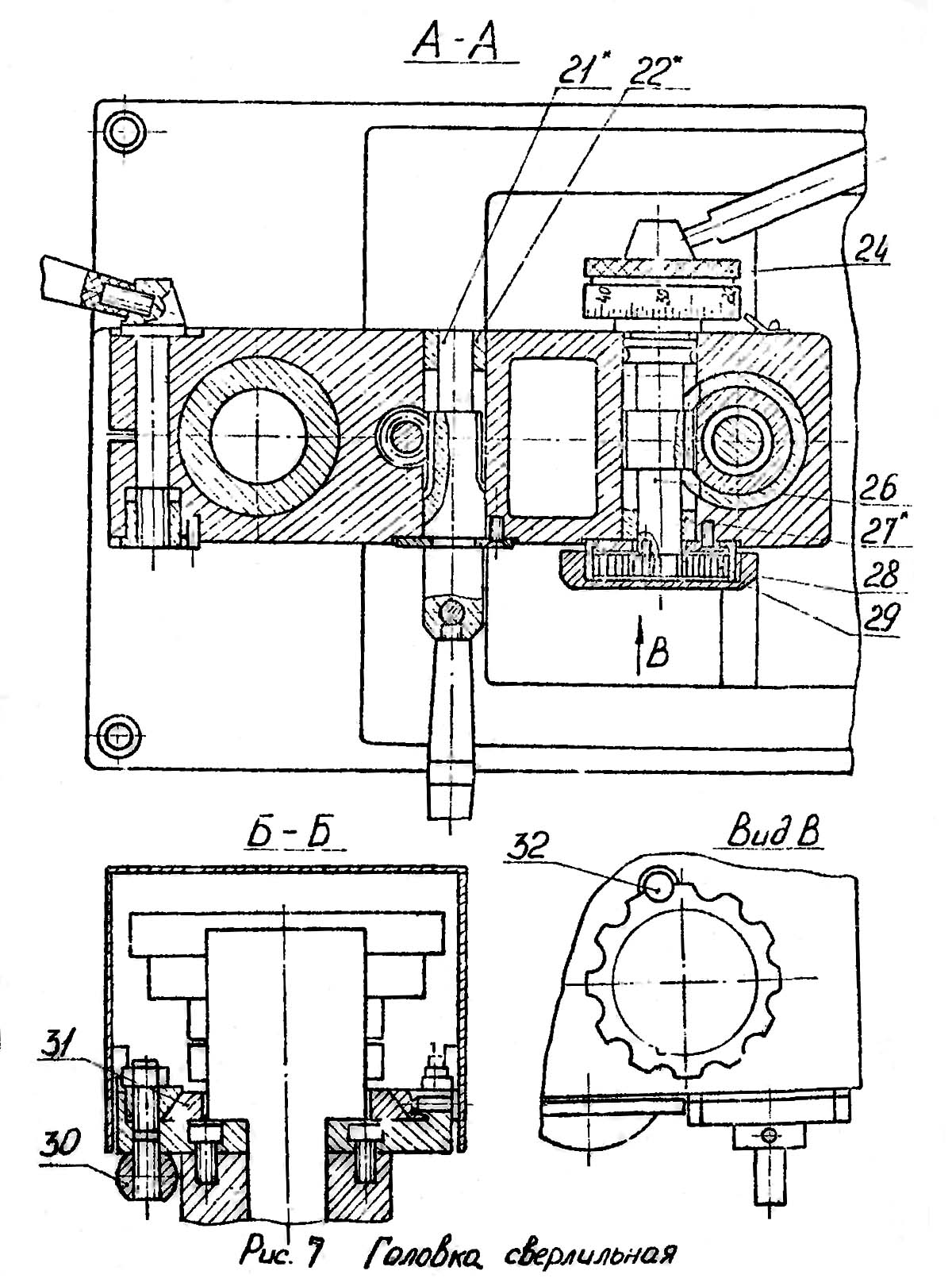 Отсчет глубины сверления производится по лимбу 24 і укрепленной на корпусе сверлильной головки стрелке. Для налаштування на заданную глубину сверления необходимо отвернуть винт на вал-шестерне 26 і повернуть корпус лимба на величину глубины сверления. Цена деления лимба - 1 мм.