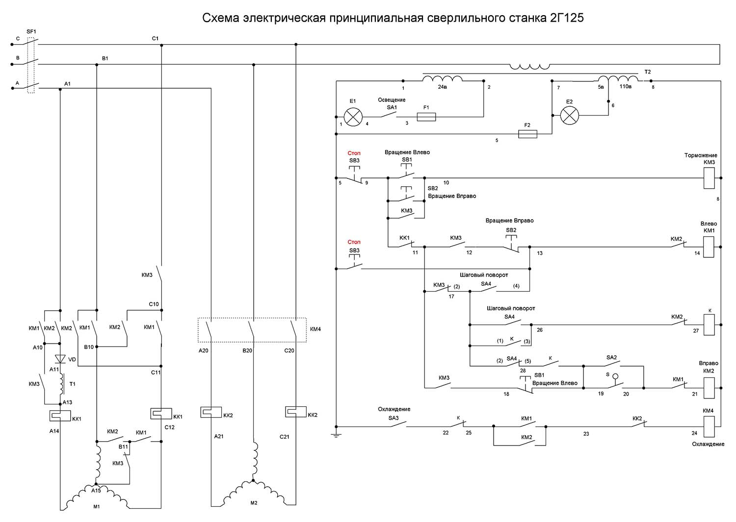 Електрична схема свердлувального верстата 2Г125. Дивитись у збільшеному масштабі
