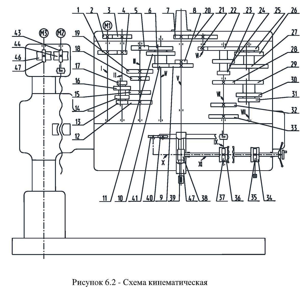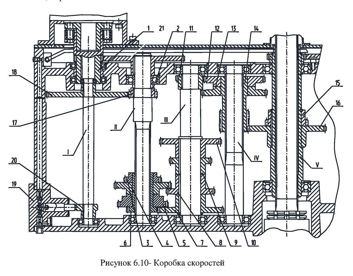 Коробка швидкостей (рисунок 6.10) расположена в верхней частини сверлильной головки і предназначена для сообщения шпинделю 12-ти ступеней частоти обертання. Различные скорости обеспечиваются за счёт увімкнення соответствующих подвижных вдоль оси валов зубчатых блоков.