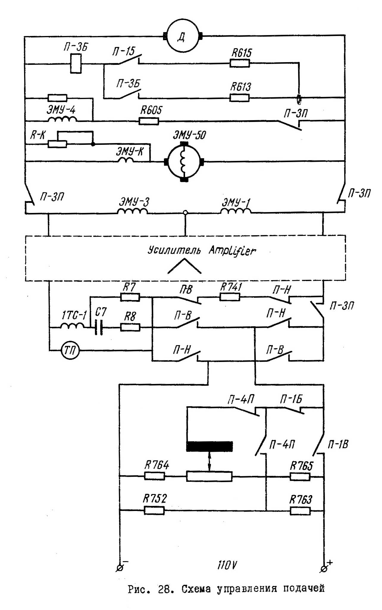 Подача і установочные переміщення органів верстата осуществляются от електродвигуна постоянного тока, скорость обертання которого може изменяться в широких пределах путем изменения напряжения питающего генератора.