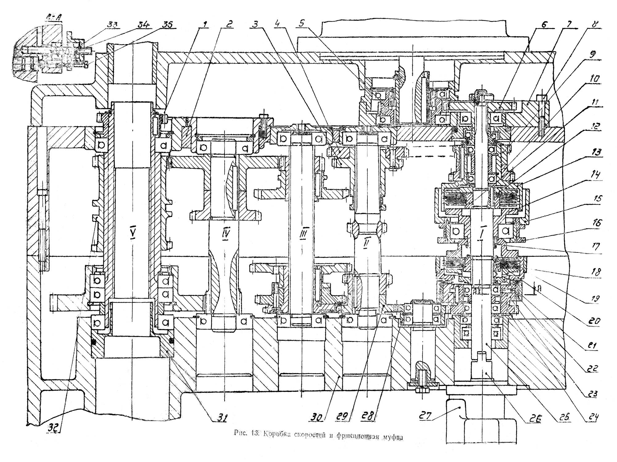 Шпиндель получает вращение от електродвигуна через промежуточную передачу, пусковую фрикционную муфту і коробку швидкостей з четырьмя передвижными зубчатыми блоками. Промежуточная передача обеспечивает определенное число оборотів вала фрикционной муфты в различных исполнениях верстата (например, для частоти тока 60 периодов). Фрикционная муфта соединяется з коробкой швидкостей либо з двойчаткой 9—10, либо через паразитную шестерню 8, нерухомо закрепленную шестерню 13. В післяднем случае коробка швидкостей получает обратное вращение, т. е. шпиндель вращается против часовий стрелки. Таким образом, каждым двум ступеням оборотів шпинделя в направлении по часовий стрелке соответствует одна, ступень оборотів против часовий стрелки.