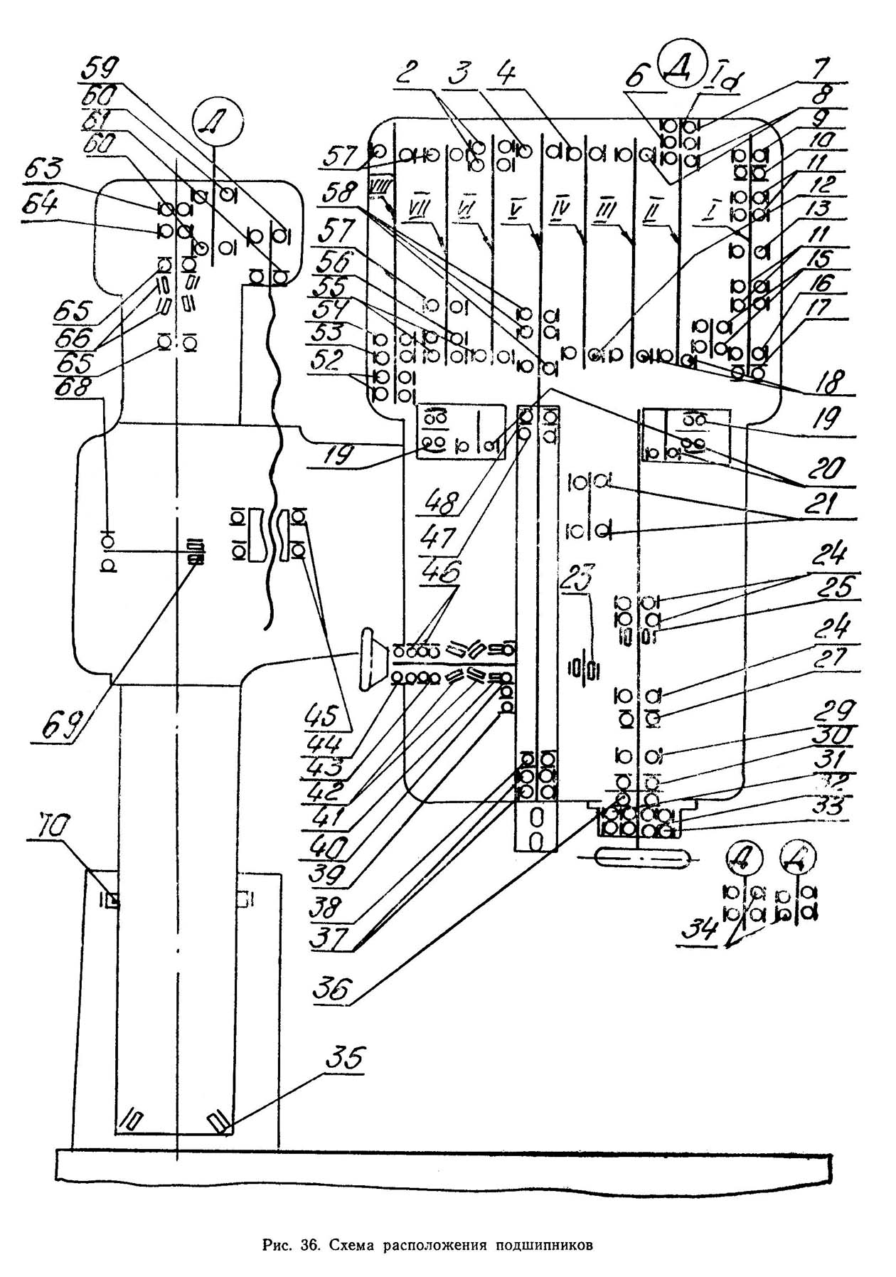 Схема установки підшибників радиально-сверлильного верстата 2М55. Дивитись у збільшеному масштабі