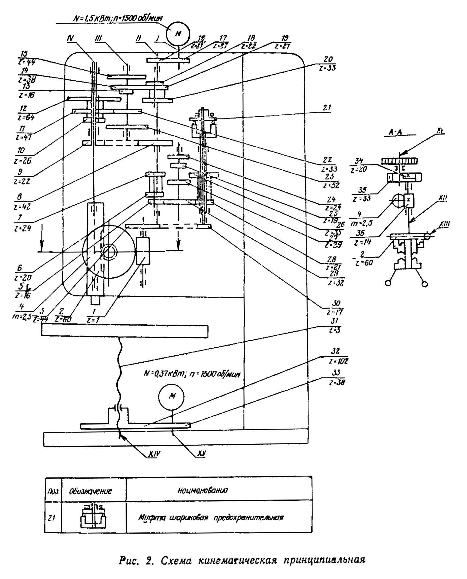 Кінематична схема свердлувального верстата 2Н118-1. Завантажити у збільшеному масштабі