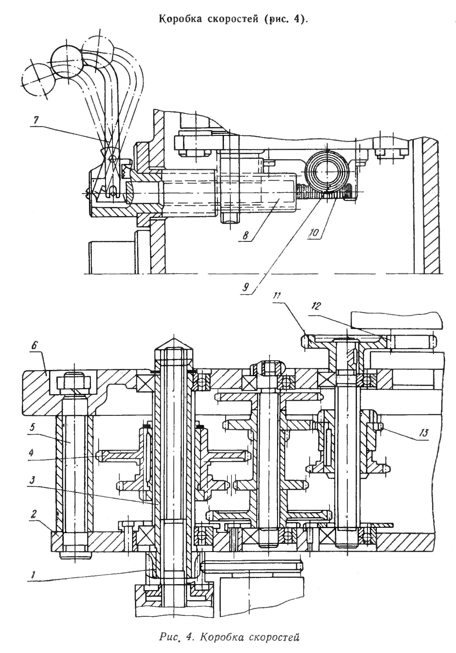 Опори валов коробки швидкостей размещаются в двух плитах — верхней 6 і нижней 2, которые стянуты между собой тремя стяжками 5. Механізм коробки швидкостей приводится во вращение от вертикально расположенного електродвигуна через зубчатую передачу 11, 12.