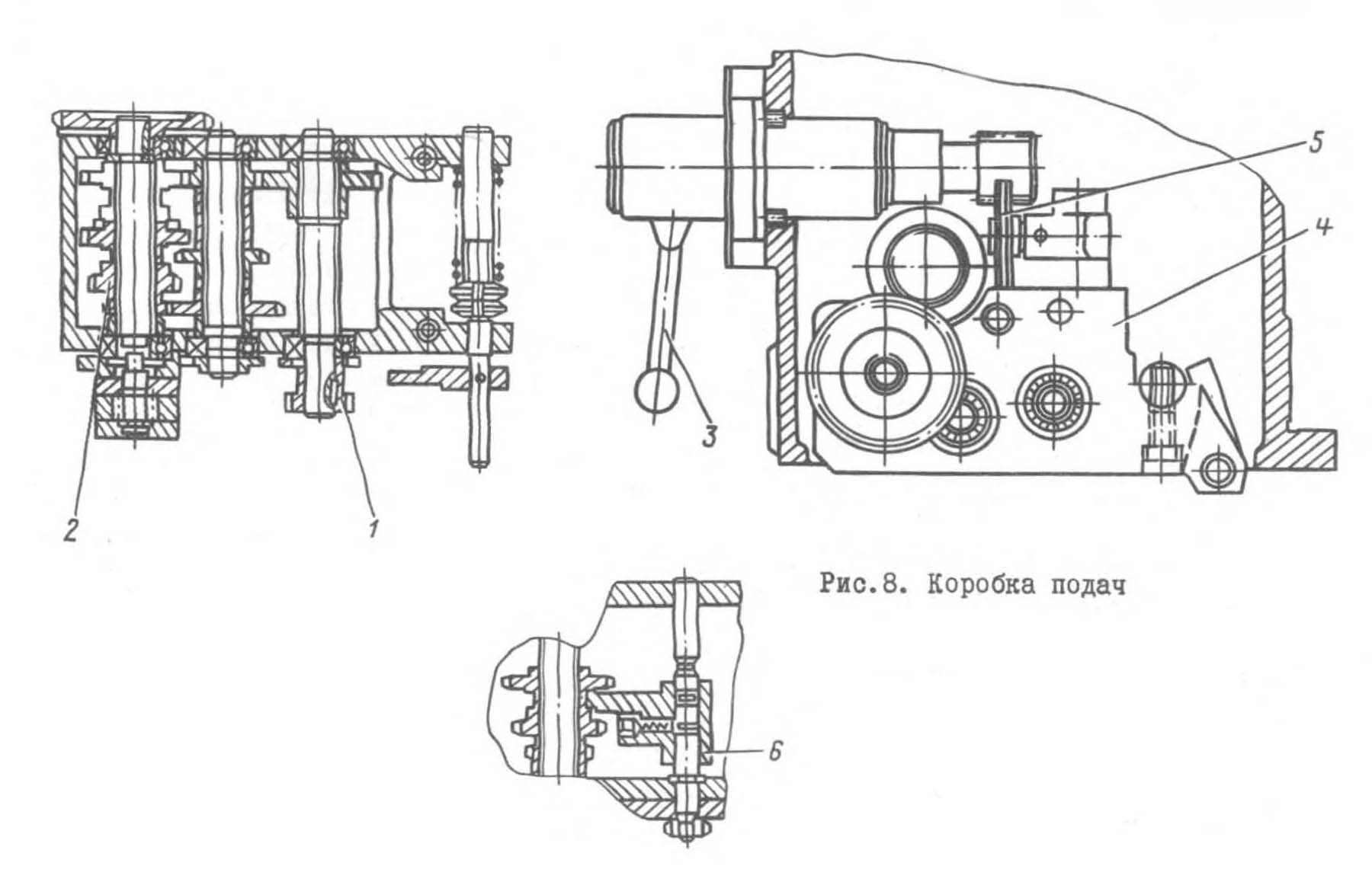 Коробка подач (рис.8) представляет собой трехваловый механізм, смонтированный в отдельном литом корпусе 4. Привід коробки подач осуществляется от шестерни 5, сидящей на гильзе 3 (рис.6) коробки швидкостей.