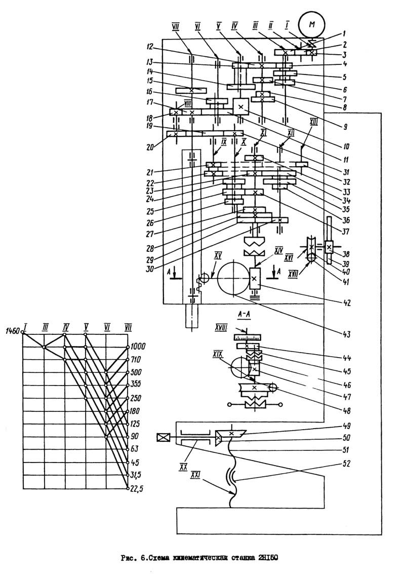 Схема кінематична сверлильного верстата 2Н150. Дивитись у збільшеному масштабі