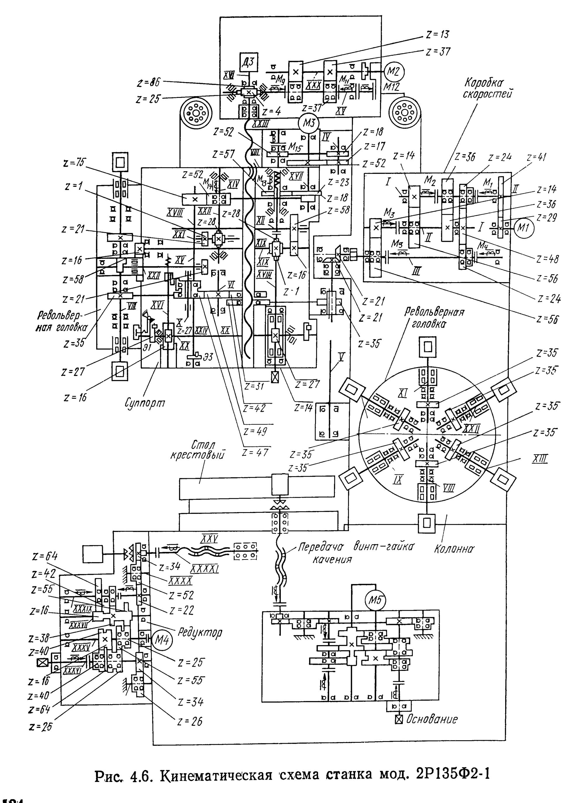 Ланцюг головного руху: двухскоростной асинхронный електродвигатель M1 (N=4/4,5 кВт; n = 1470/990 об/мин) — зубчатая передача 29/41—вал I — вал II (через передачи 24/48 і 36/36 при включенных муфтах М1 і М2 или через передачу 14/36 при включенной муфте М3) —вал III (через передачи 14/36 і 48/24 при включенных муфтах М4 і М5) —вал V через коническую зубчатую передачу 21/21 — на один из шпинделей револьверної головки через передачи 35/42; 31/49; 49/47; 47/35.