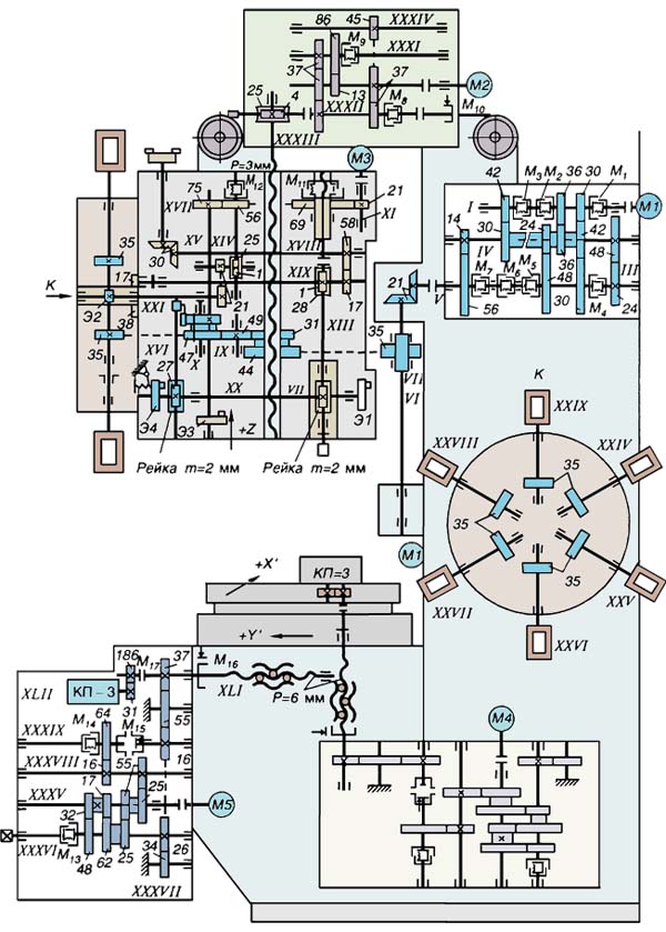 Кінематична схема верстата (рис. 4.6) состоит из следующих независимых кинематических ланцюгів: приводу головного руху (вращение шпинделей револьверної головки); приводу подач крестового стола; приводу суппорта з револьверною головкою; поворота револьверної головки; выпрессовки инструмента из шпинделей.