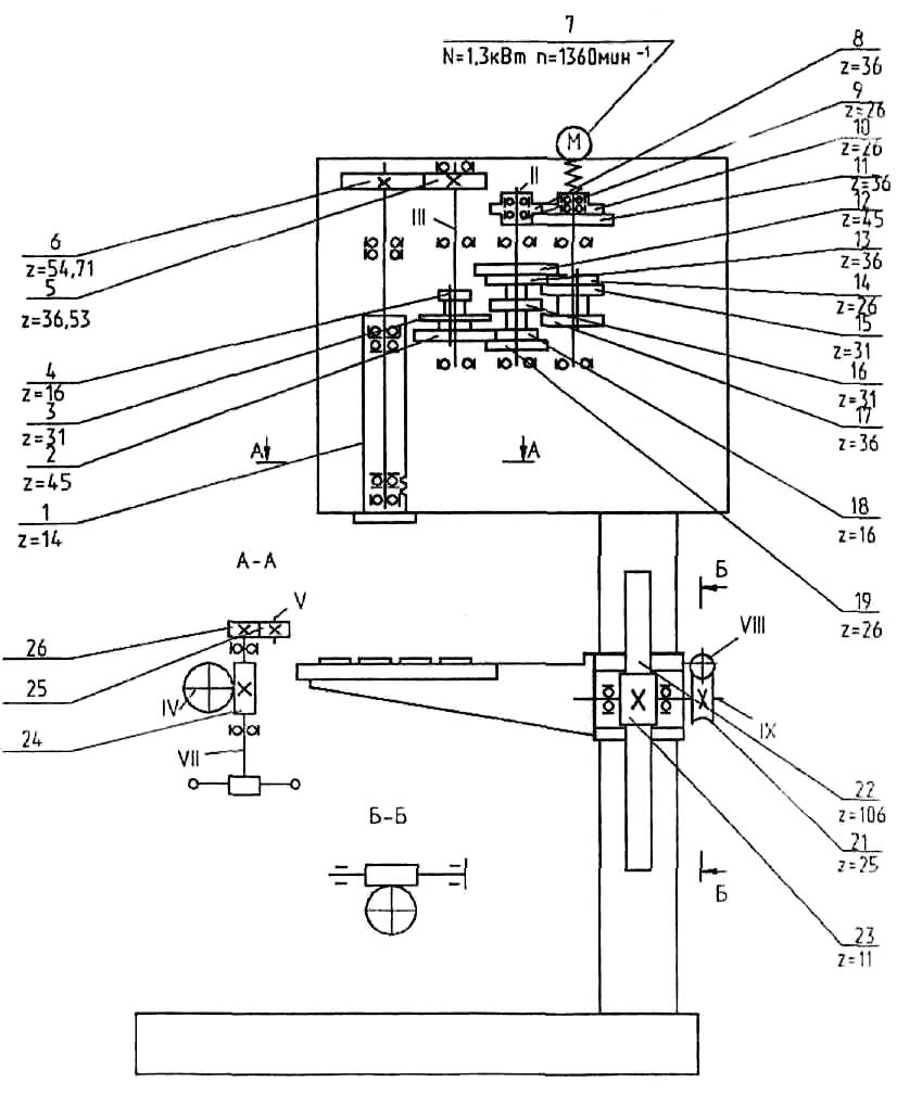 Кінематична схема свердлильного верстата 2С125. Дивитись у збільшеному масштабі