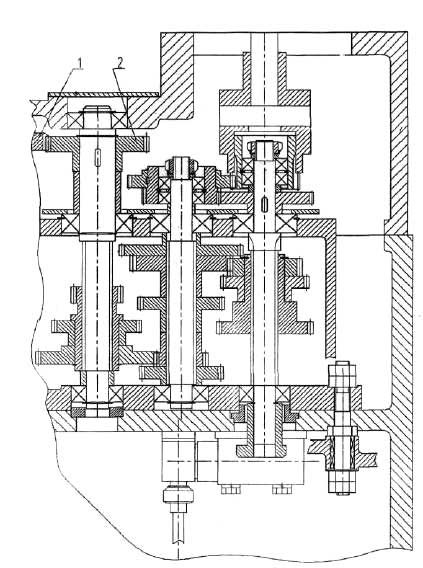 У верхній частинині корпусу свердлильної головки знаходиться коробка швидкостей (рис.7), підмоторна плита з електродвигуном. Перемикання швидкостей здійснюється рукояткам вручну.