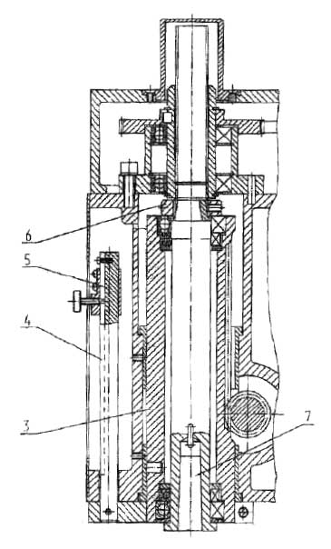 Шпиндель установлен на двух радиальных і двух упорных підшипниках. Все підшипники расположены в пиноли 3, которая з помощью реечной пары перемещается вдоль оси. Регулювання зазоров в підшипниках производится гайкой 6.