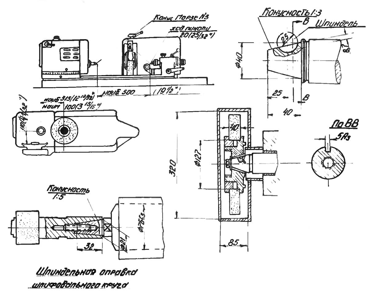 Фланцы з шлифовальным кругом монтируются на левый конусный конец шпинделя і закрепляются центральным винтом з шайбой. Для исключения проворачивания круга фланцы посажены на шпонке. Точно таким же образом на правом кінці 7 шпинделя крепится шкив 8, который двумя клиновидными ремнями приводится во вращение електродвигуном, установленным в корпусе шлифовальной бабки.