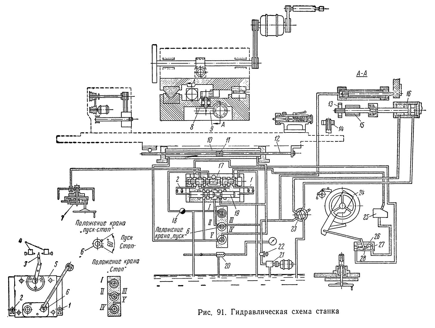Если требуется ввести в действие ручное перемещение стола, то переключают кран 6 из положения «Пуск» в положение «Стоп», при етом реверсивный золотник 19 отключается от линии нагнетания і обе полости цилиндра 10 соединяются, что дает возможность вручную перемещать стол.