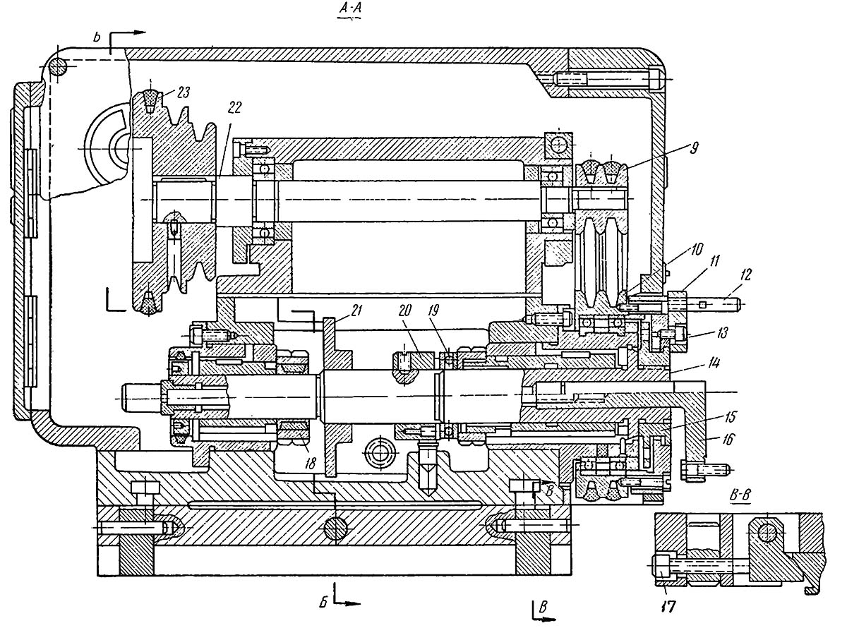 Привід передньої бабки устроен следующим образом. На валу двухскоростного електродвигуна 2 установлен трехступенчатый шкив 1, который посредством клиновидного ремня передает вращение шкиву 23, закрепленному на левом кінці промежуточного вала 22. На правый конец етого вала насажен шкив 9, который посредством двух клиновидных ремней передает вращение шкиву 10, соединенному з планшайбой 11.