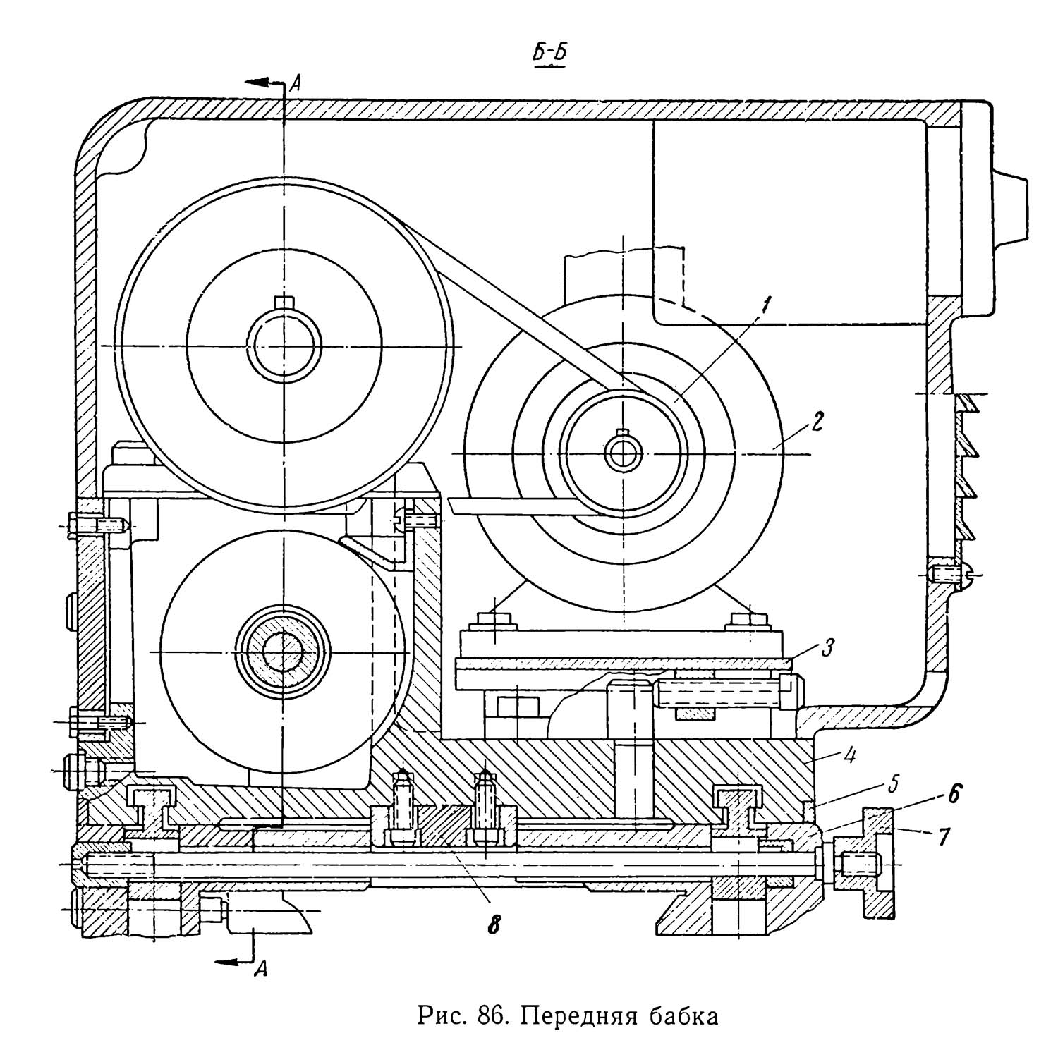 Скорость обертання шпинделя передньої бабки определяется числом оборотів електродвигуна і положением ремня на шкиве 23. Возможные числа оборотів шпинделя в минуту: 150; 250; 300; 400; 500 і 800. Для перестановки клиновидного ремня з одной ступени на другую перемещают з помощью гвинта салазки 3 вместе з електродвигуном в сторону шпинделя і після освобождения ремня переставляют его на необходимую ступень; затем отводят салазки назад до создания необходимого натяга.
