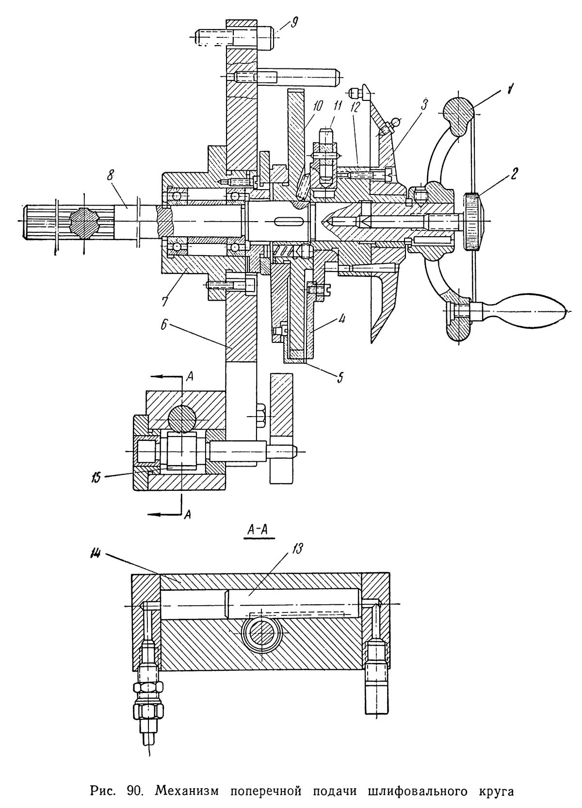 Шестерня 14, сидящая на валике маховика, вращает шестерню 13, сидящую на валу червяка 15. Червяк вращает червячное колесо 9, закрепленное на одном валу з шестерней 8, которая, вращаясь, передвигает рейку, а з ней салазки шлифовальной бабки.