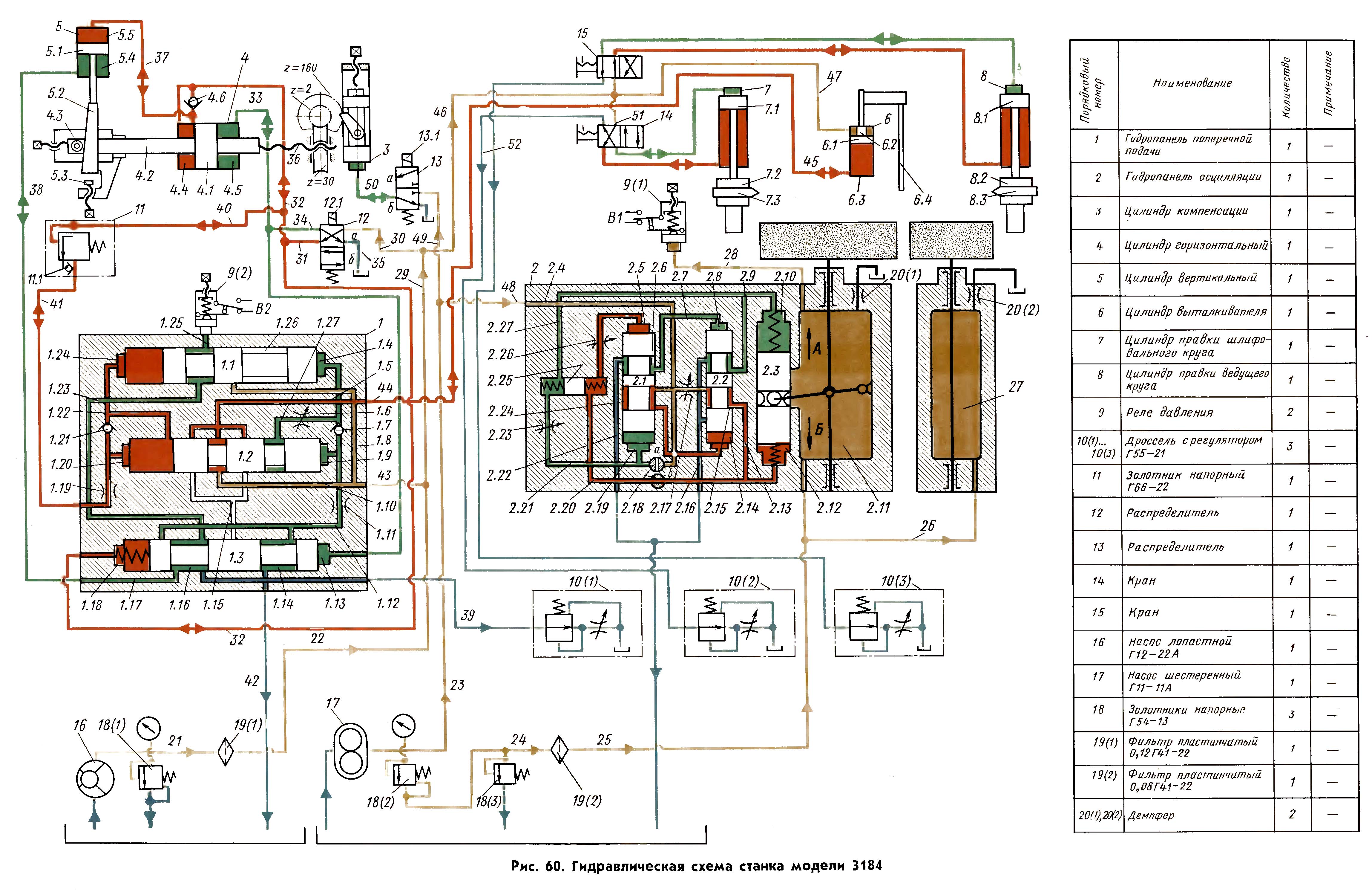 Гідравлічна схема круглошлифовального верстата 3184. Дивитись у збільшеному масштабі
