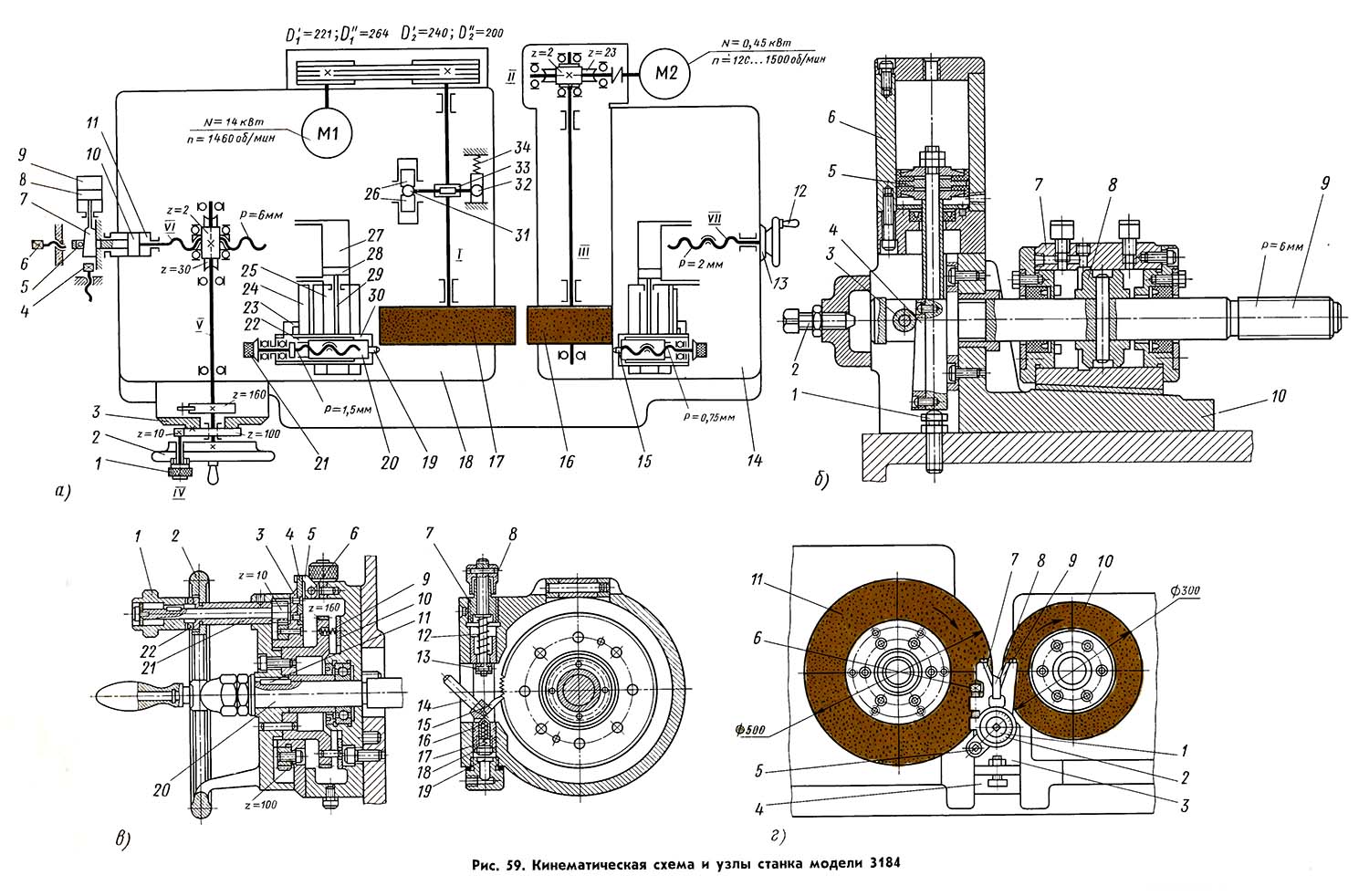 Схема кінематична круглошліфувального верстата 3184. Дивитись у збільшеному масштабі
