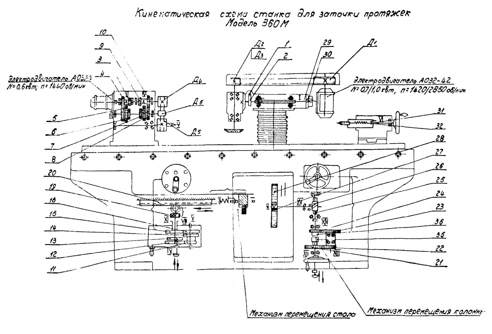 1. 360м Кінематична схема заточувального верстата для протяжок. Завантажити у збільшеному масштабі
