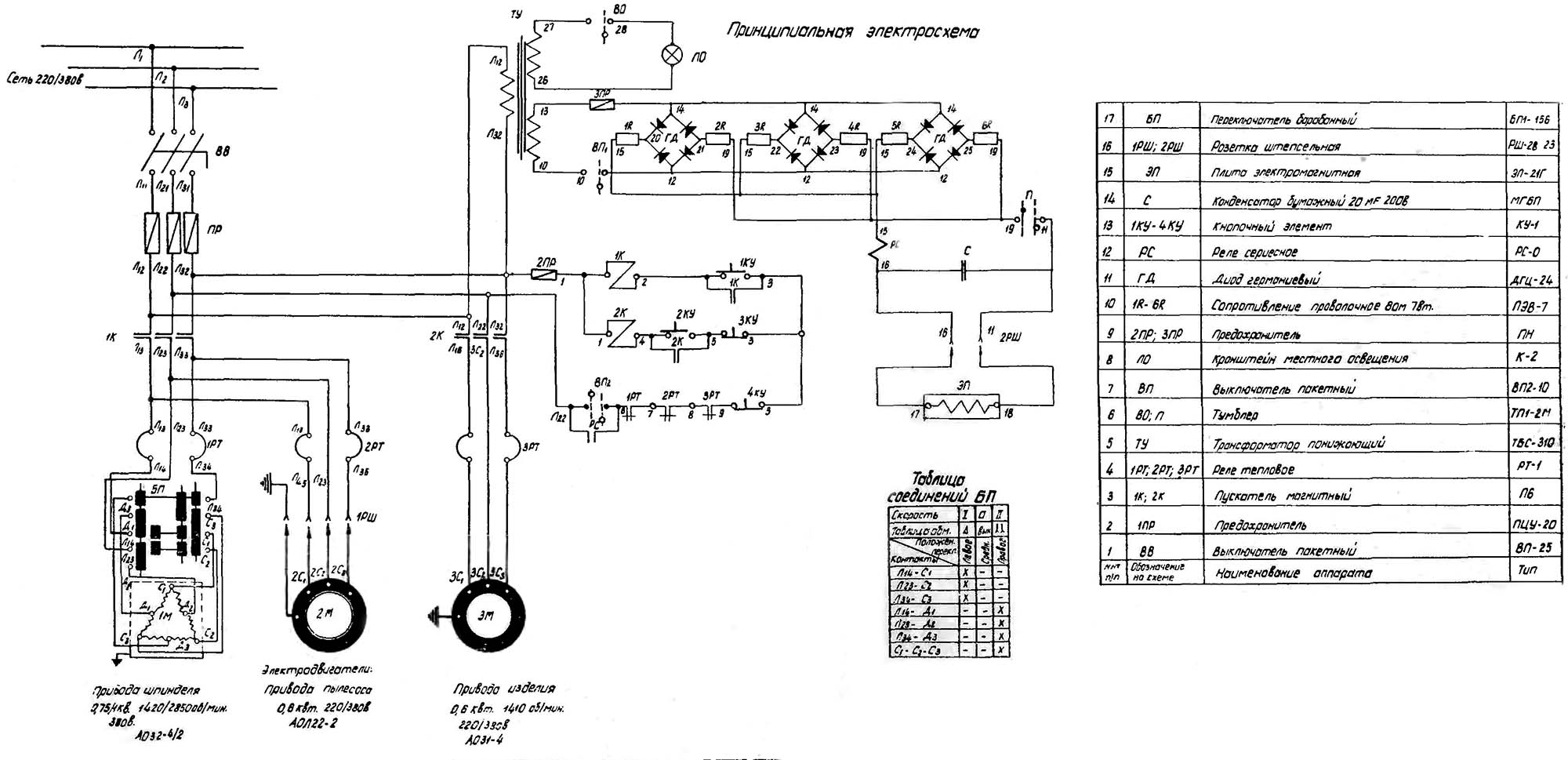 После подачі напряжения на германиевый выпрямитель включается реле РС-О і Н.О. контакт в точках Л22-6 замыкается. После етого нажатием кнопки 1КУ включается електродвигатель шпинделя, нажатием кнопки 2КУ включается привід вироби і производится обработка.