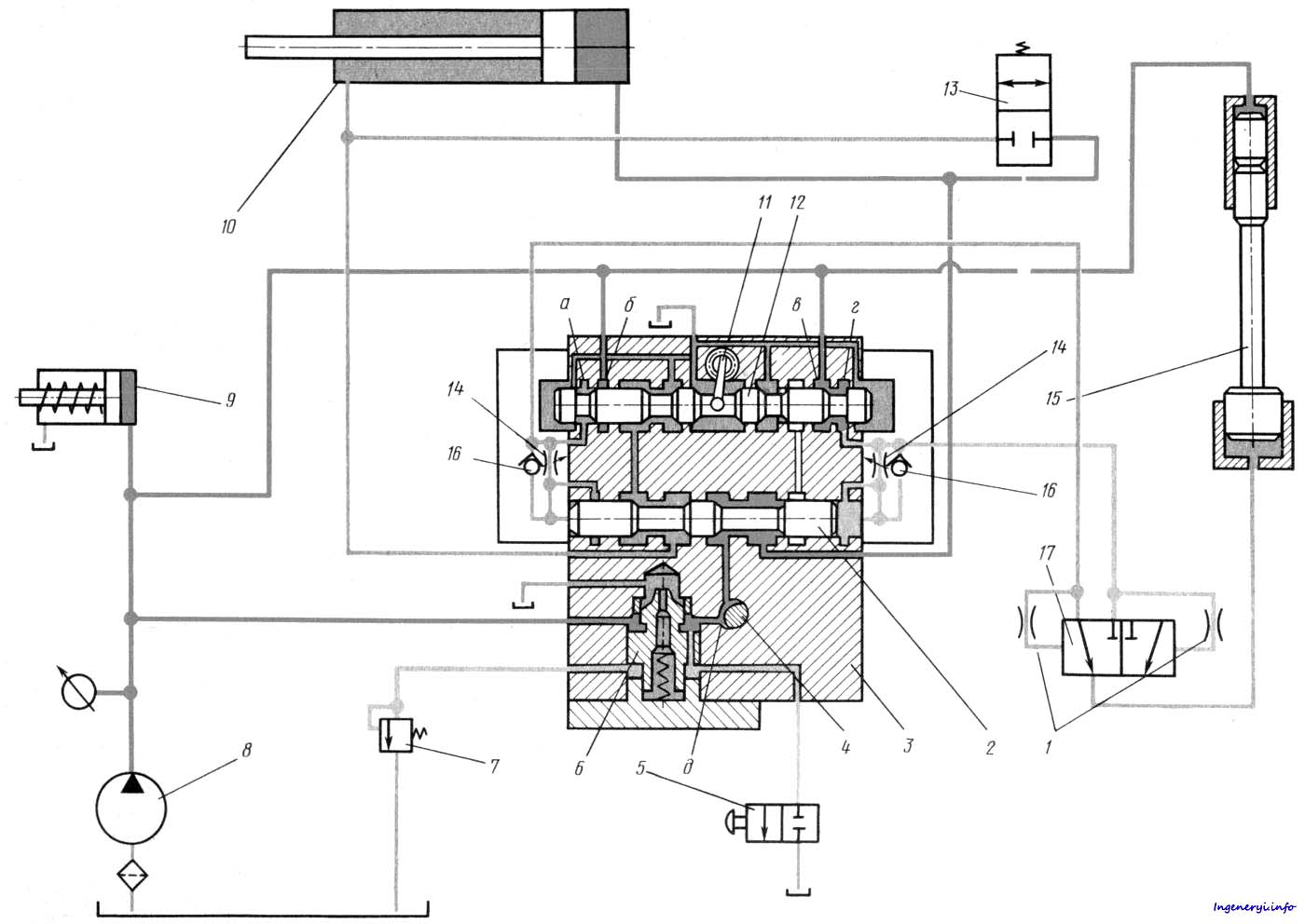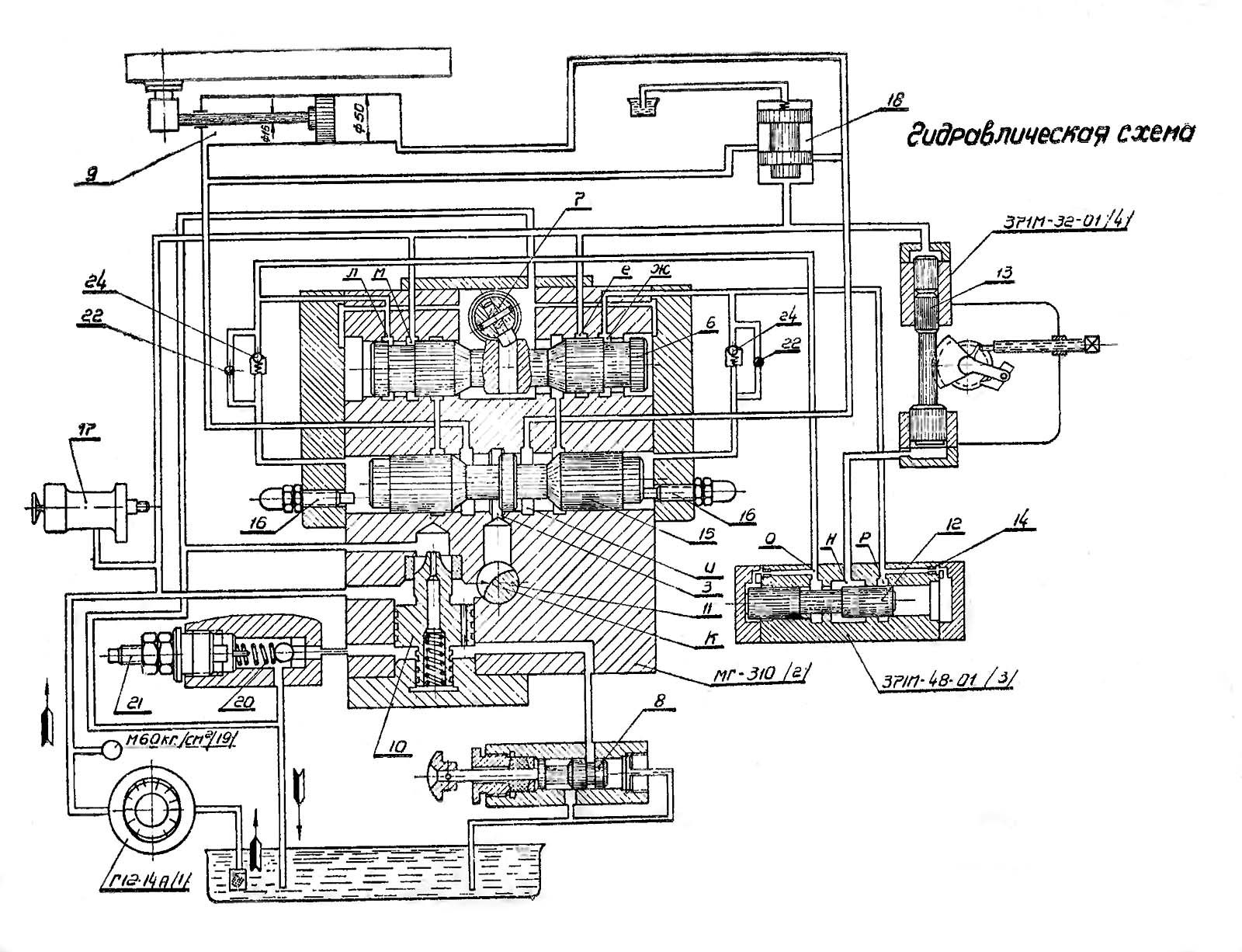 Гідравлічна схема плоскошліфувального верстата 371м-1. Дивитись у збільшеному масштабі