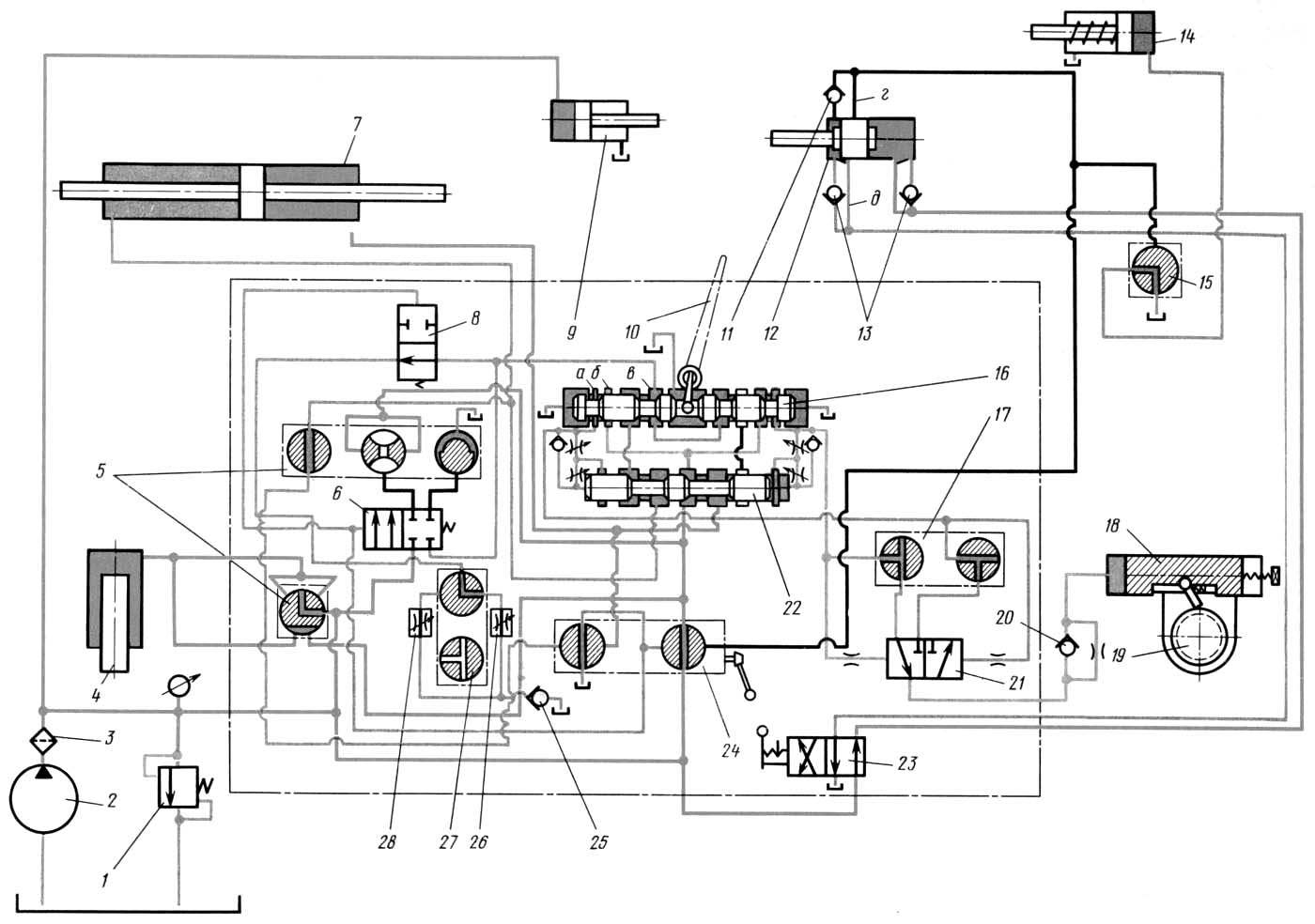 При відведеній шліфувальній бабці, тобто при правому положенні поршня циліндра 12 відкривається канал і з штокової порожнини циліндра 12 масло через цей канал подається до інших елементів гідросистеми.