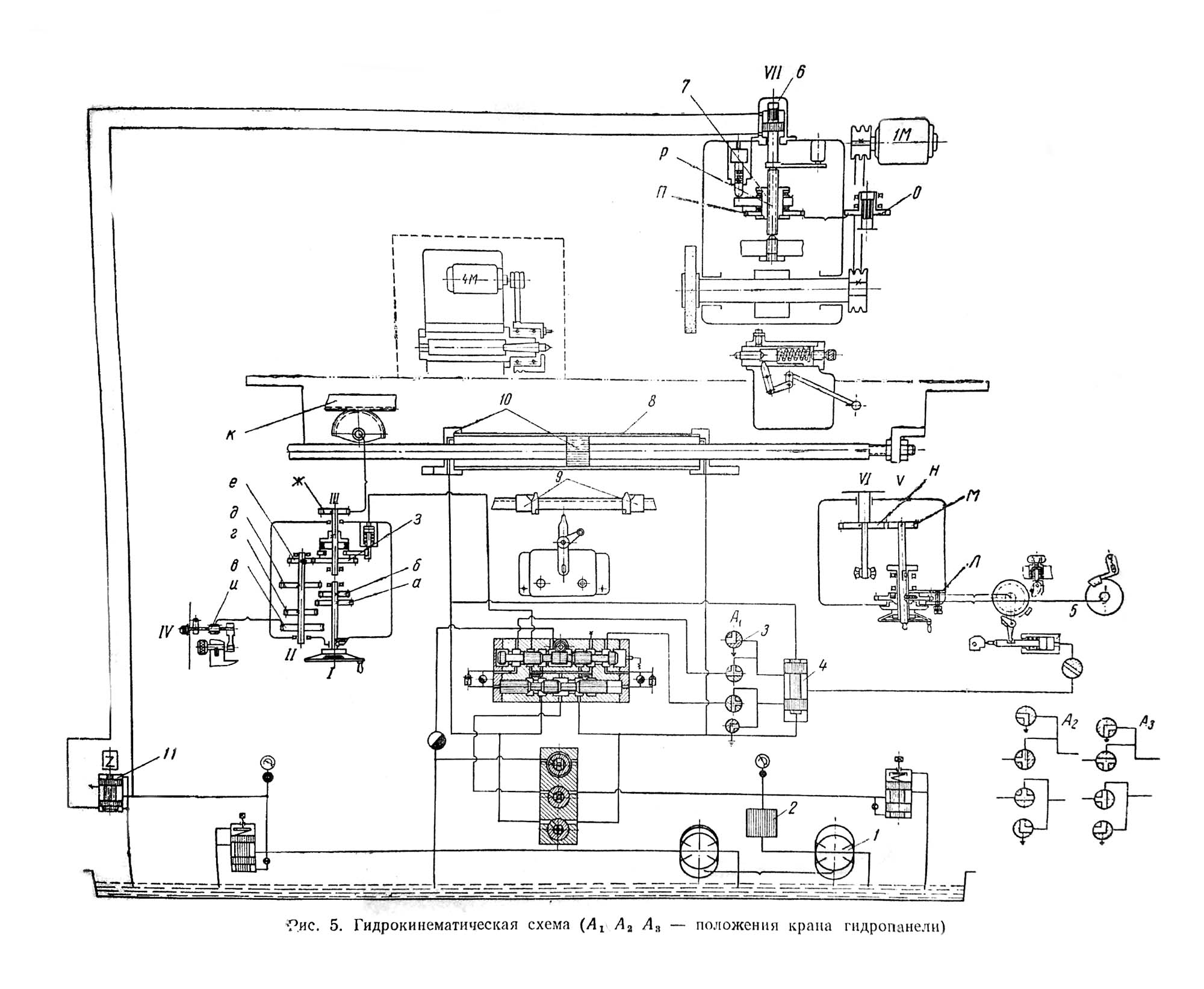 Масло из бака засасывается сдвоенным лопастным насосом 1 і через фильтр подается по трубам: к предохранительному клапану, к манометру, к крану гідропанелі, к золотнику швидкого подвода шлифовальной бабки і цилиндру выборки зазоров механізма подачі шлифовальной бабки. От крана гідропанелі через соответствующие проточки масло поступает в правую или левую полости цилиндра 8 стола (в зависимости от положения золотника).