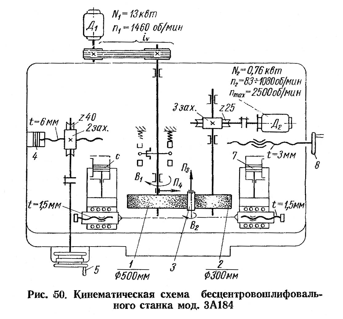 Шпиндель II бабки ведущего круга получает вращение от електродвигуна постоянного тока через муфту, вал I і червячную пару 4, 3.