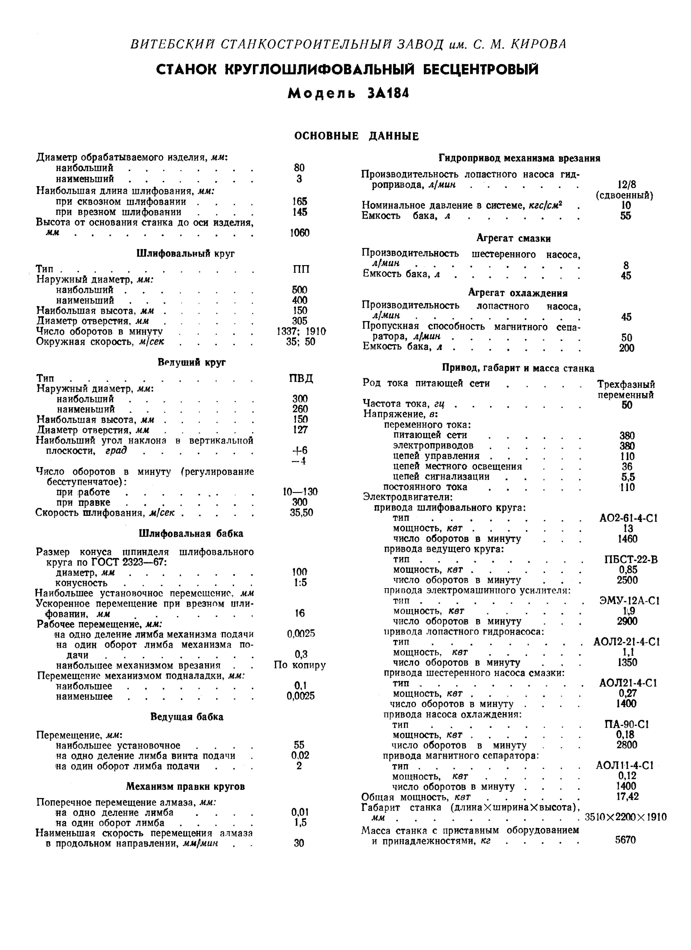 Технічні характеристики бесцентровошлифовального верстата 3А184. Дивитись у збільшеному масштабі
