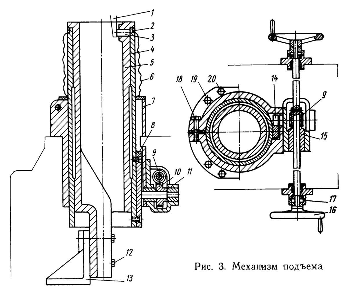 Механізм подъема (рис. 3) шлифовальной головки установлен на верхней стенке станины между направляющими. Горловина 7 прикрепляется к станине болтами 20 після выверки і установки регулировочными гвинтами 19 положения її оси перпендикулярно плоскости стола. В отверстии горловины перемещается гильза 4 з рейкой 8, сцепляющейся з зубчатым колесом 14. Дополнительное назначение рейки 8 — препятствовать повороту гильзы. Для жесткого крепления гильзы верхняя часть горловины разрезана і при затягивании гайки 18 охватывает гильзу по типу клеммового зажима. В нижней частини горловины 7, расположенной внутри станины, закреплен кронштейн 11 з червячным редуктором 9, 10, приводимым во вращение маховиками 16. От осьового переміщення вал червяка удерживается втулкой 15 Осью червячного колеса 10 является хвостовик реечной шестерни 14. Отсчет величины вертикального переміщення з точностью 0,02 мм производят по шкалам установочных колец 17 Выступающую часть гильзы от пыли предохраняет матерчатый чехол 6. На верхний торец гильзы опирается фланцем колонна 5, несущая шлифовальную головку і кронштейн 13 з електродвигуном і позволяющая поворачивать в горизонтальной плоскости шпиндель. Угол поворота указывает шкала 2. Зажим колонны осуществляется тормозным пальцем 3, на который давит коромысло шлифовальной головки 1.