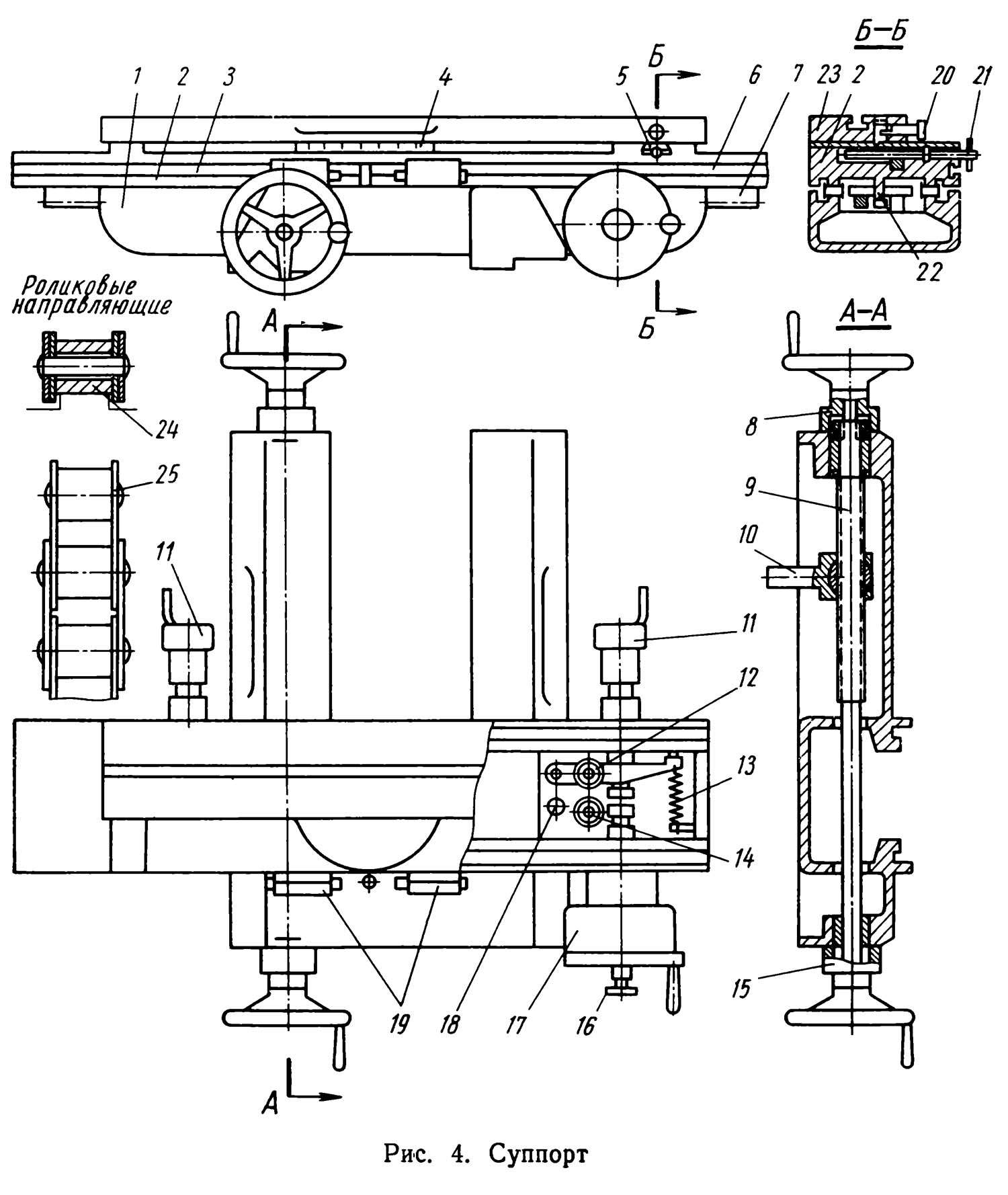 Суппортное пристрій (фиг. II, 74) имеет нижние салазки 17, продольный стол 15 і поворотный стол 18. Нижние салазки 17 перемещаются по направляющим станины з помощью гвинта 14 і гайки 13 при вращении одного из маховичков 10. Дублирование етого маховичка имеет целью обеспечить удобство обслуживания верстата. Продольный стол 15 перемещается по направляющим 12 нижних салазок, выполненным в виде направляючих качения. Быстрое перемещение производится рукояткой 16 через реечное колесо 24 і рейку 25, медленное перемещение — рукояткой 19, скрепленной з корпусом планетарного механізма, передаточное отношение которого равно 1/10 . Для предотобертання боковой игры продольного стола по концам нижних салазок посажены на осях по два шарикопідшипника 32 і 35, которые охватывают з обеих сторон гребень 26 продольных салазок. Для возможности регулювання зазору между гребнем 26 і роликами-шарикопідшипниками 32 і 35 оси підшибників 35 закреплены в качающихся рычагах 34 і пружинами 33 прижимаются к боковой стенке гребня 26.