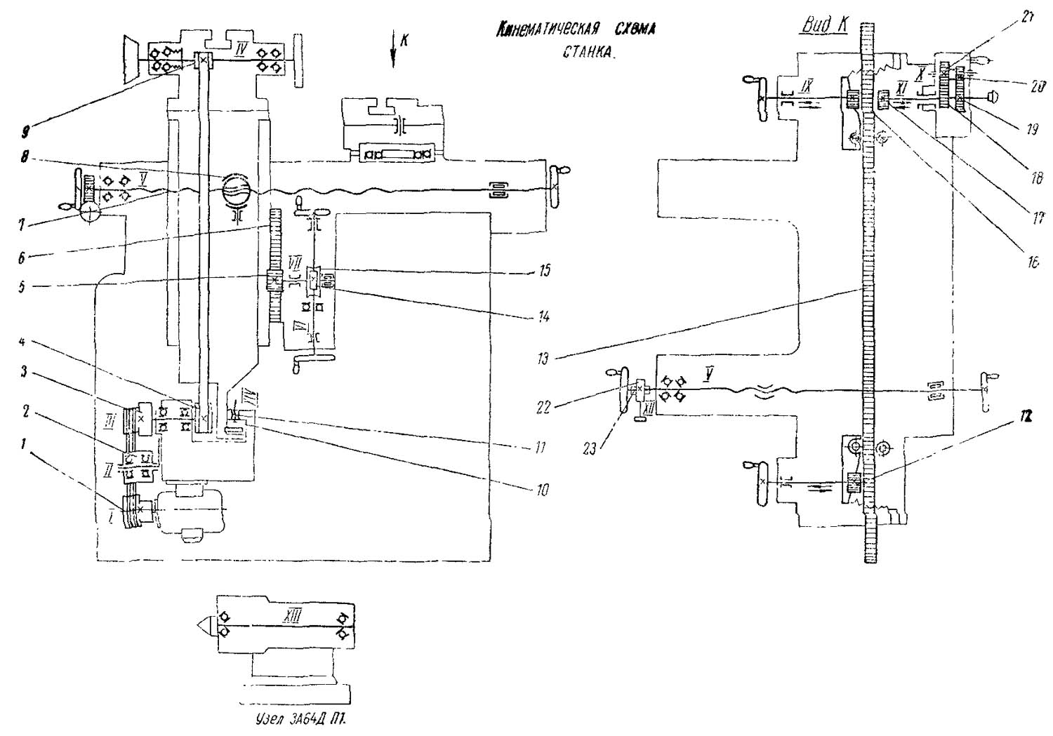 Схема кінематична заточного верстата 3А64Д. Скачать в увеличенном масштабе